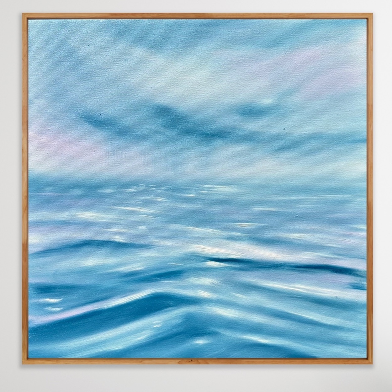 This oil painting has soft purple in the sky that reflects on the eater’s surface with rain on the distance. It comes in a timber floating frame to make the perfect gift, ready to hang.