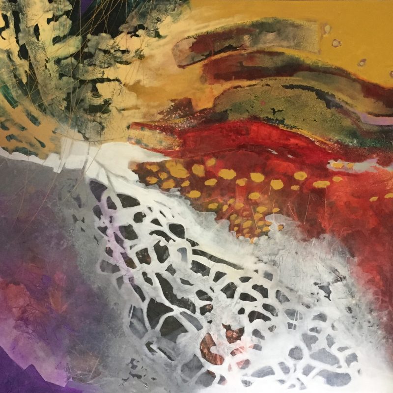 A serene, imagined landscape made with colours I love, with stark white trees. I have an ongoing dialogue with rocks, trees and water that continue to make their presence felt on my canvases.