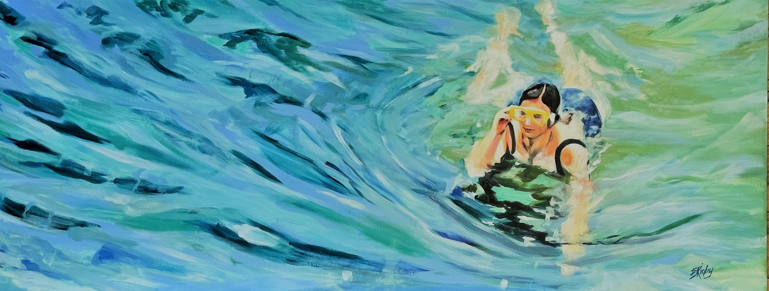 Swimmers in the waters of Monterosso, Cinque Terre was the inspiration for this painting. It was a glorious day as we began our walk to Vernazza and I would have dearly loved to have joined the swimmers in the ocean but, our time was limited and we were determined to hike to at least one of the villages. By the time we reached Vernazza the temperature was 34 degrees centigrade. We were there only for two nights and the dip in the ocean was not to be. Many times I have looked at the photographs and wished that we had managed to have that swim but I guess I can almost imagine that the figure in this acrylic work was me. Professional Atelier acrylic paints on stretched canvas and unframed.