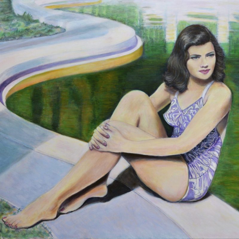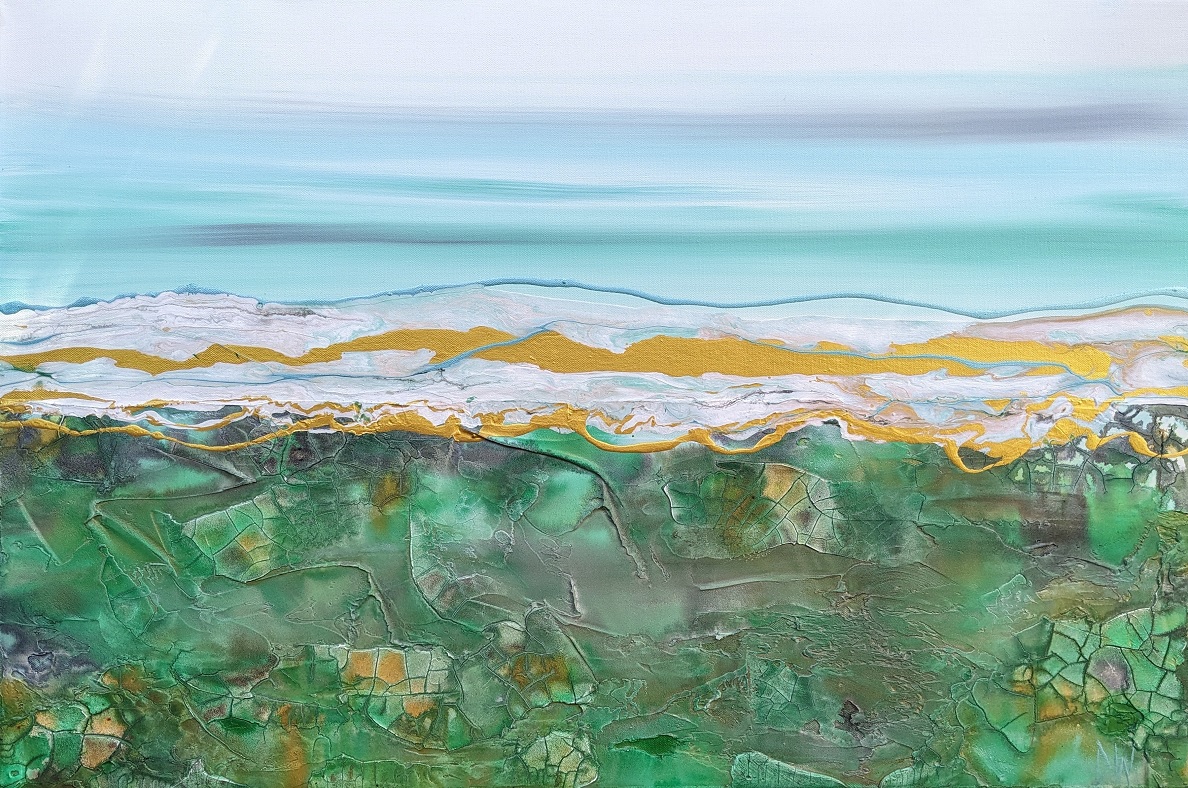 This abstract landscape painting features a soothing blend of cool, refreshing colours.