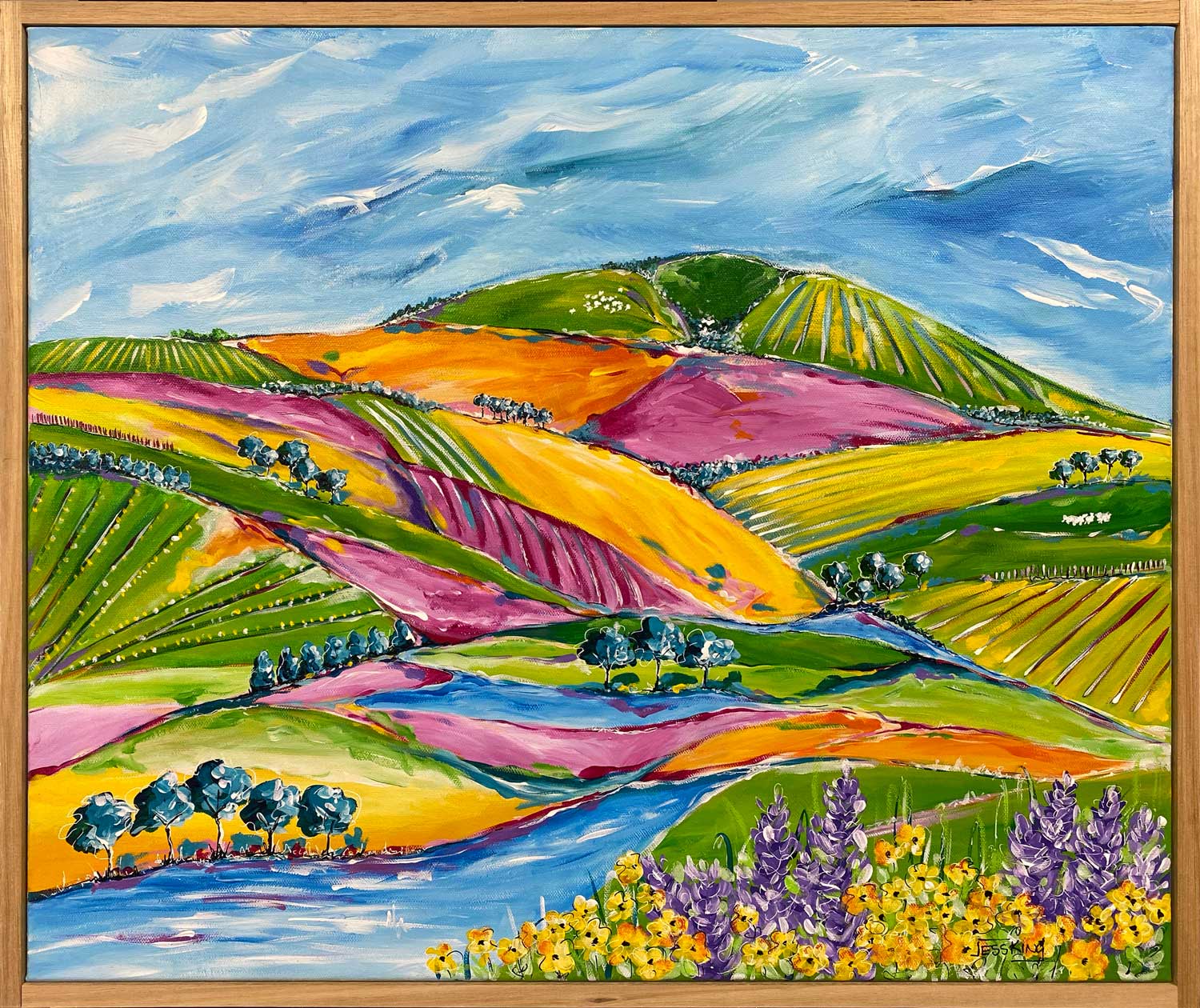 Inspired by a recent holiday to Rainbow Beach the rolling hills drew me in and I could feel the colours rolling into one another. The scenery on the journey was breath taking and this is my interpretation of the beauty of nature.