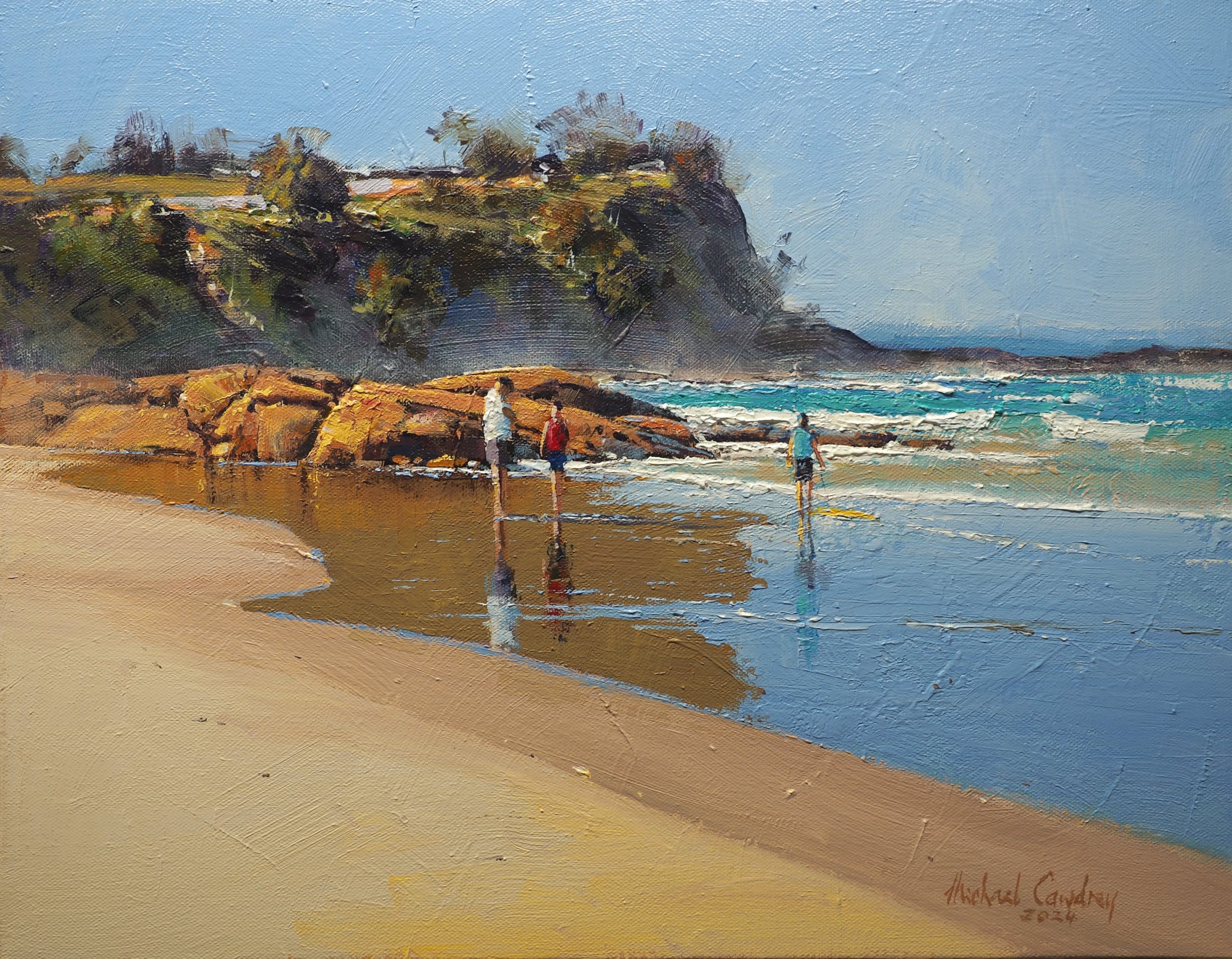 Coolum Reflections by Michael Cawdrey – Depicting a beautiful sunny afternoon at Coolum, on Queensland’s Sunshine Coast, this acrylic painting is 45×35 centimetres, on deep-sided stretched canvas, triple-primed by me.