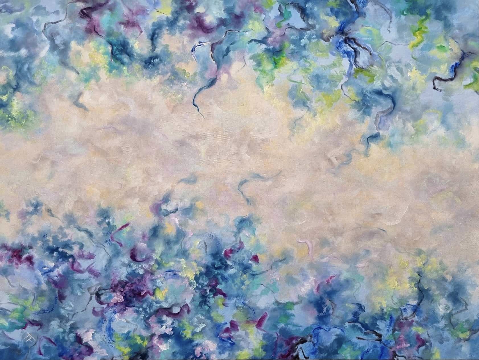 When I begin a new abstract piece, I’m never quite certain what will emerge. Throughout the process, a particular imagery begins to form in my mind. Is it a tree branch? A flower? A sky or a river? It could truly represent anything. It’s merely colors arranged in a certain way. Everyone can perceive what they feel. For me this serene and calming piece conjures images of a coral cay or reef, while also evoking the imagery of tree branches and spring blossom against a sky backdrop.