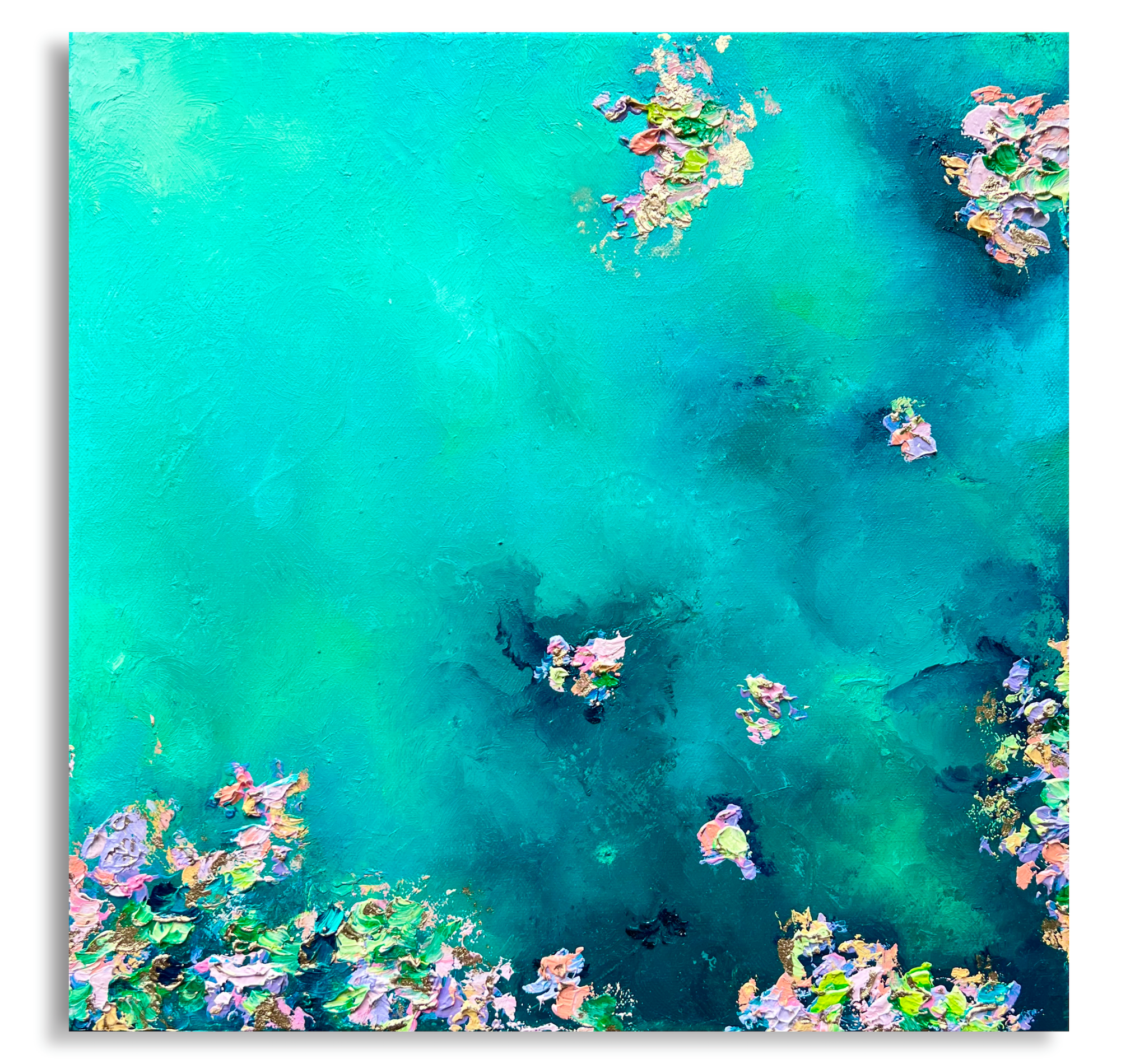 This artwork was born from awe-inspiring moments on a paddleboard in the Firelight Beach. The painting captures the captivating spectacle of corals lighting up beneath the water’s surface during the golden hour.