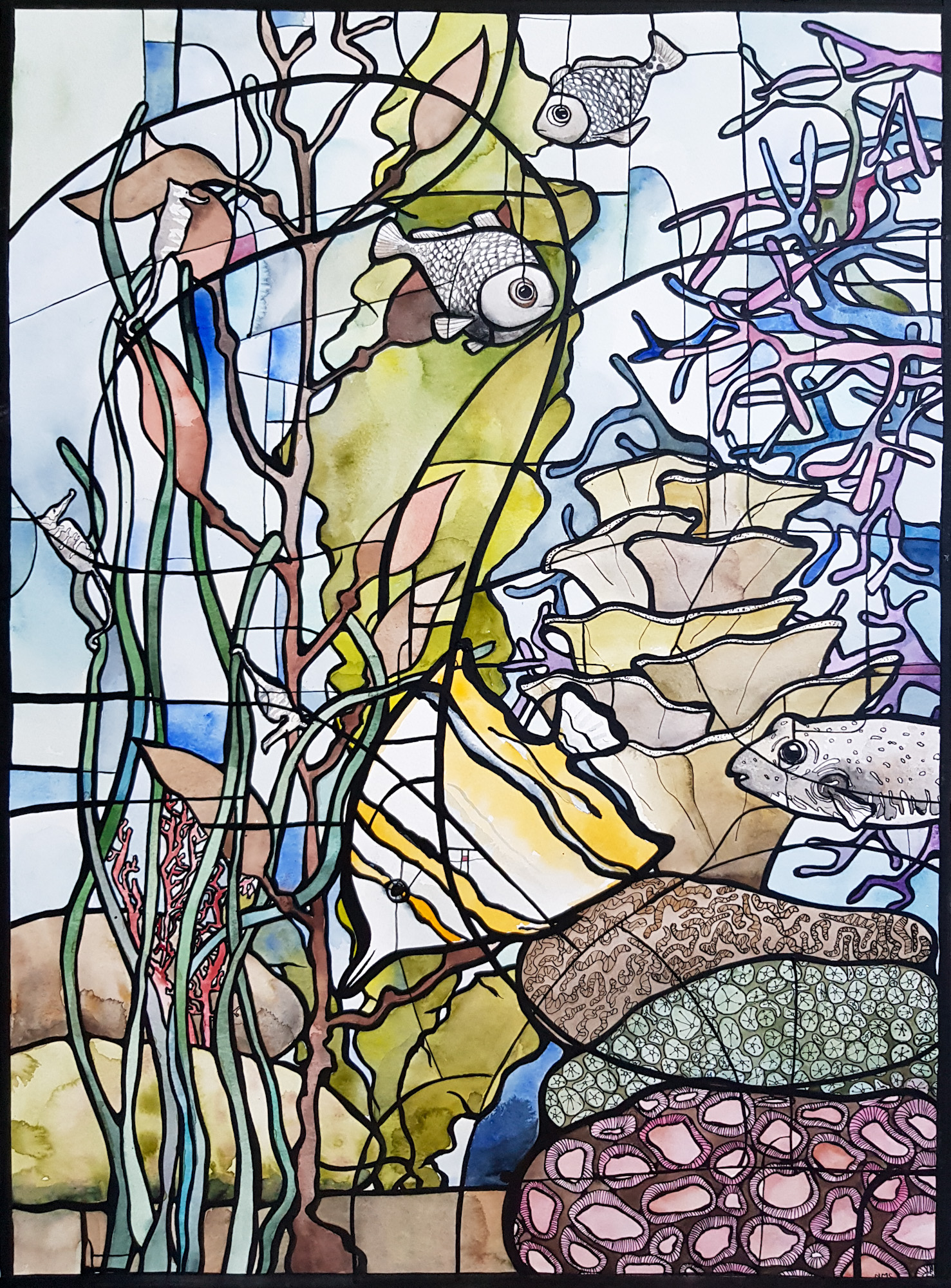 Coral Garden is a large watercolour and ink vista of an underwater world of coral, rock, seaweed and grass with fish flitting past and seahorses clinging onto the grasses.