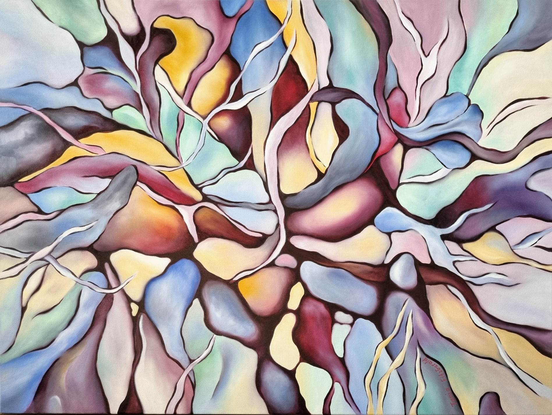 This is an abstract oil painting. It has an organic feel, reminding of something living. Maybe coral reef?