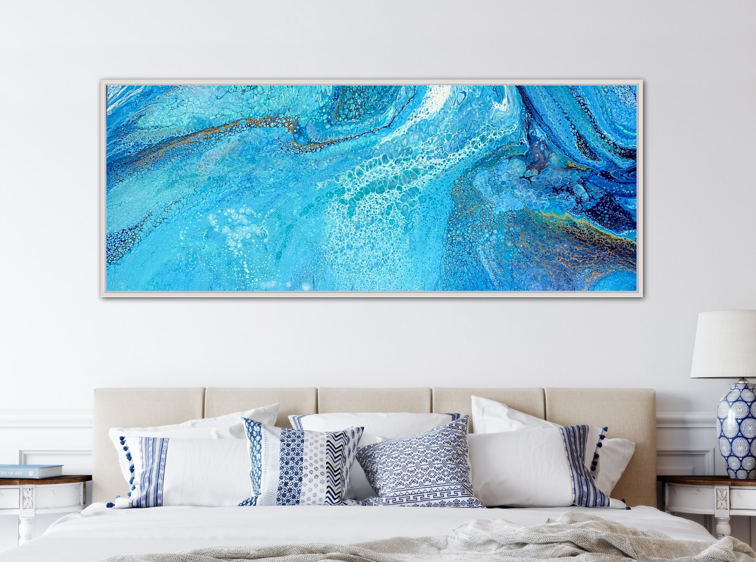 This artwork has been finished with layers of professional grade archival varnish for extra protection, colour enhancement and a beautiful smooth finish. The metallic paint used reflects the shifting light beautifully really bringing the painting to life.