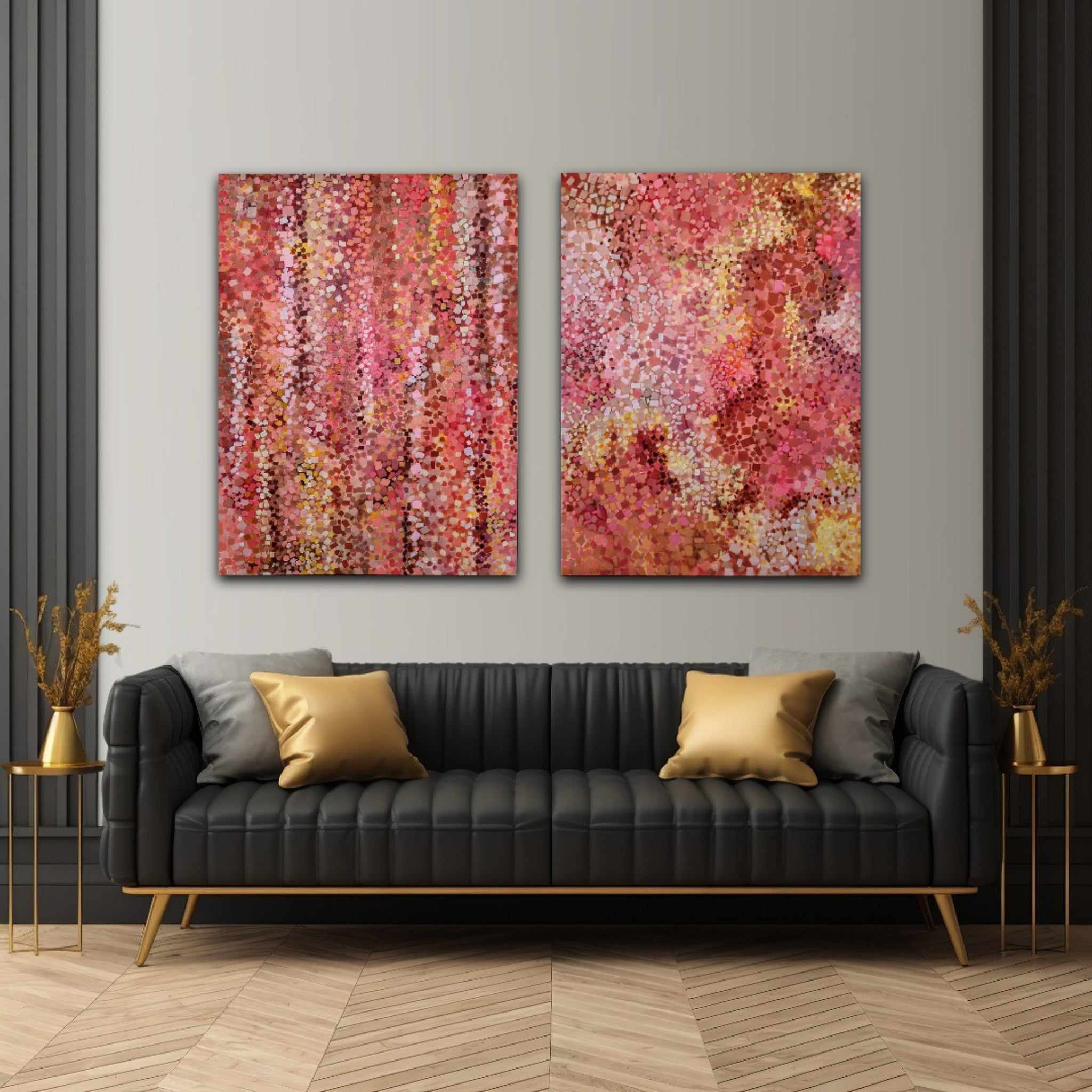 Here is my new diptych – two paintings that share the same colour scheme and are connected yet intentionally different, creating a visual explosion. Together, they form a striking combination and are sure to make a statement in any interior, balancing each other out. This energetic artwork exudes a certain rhythm. It’s bright yet muted, with a strong positive vibe.