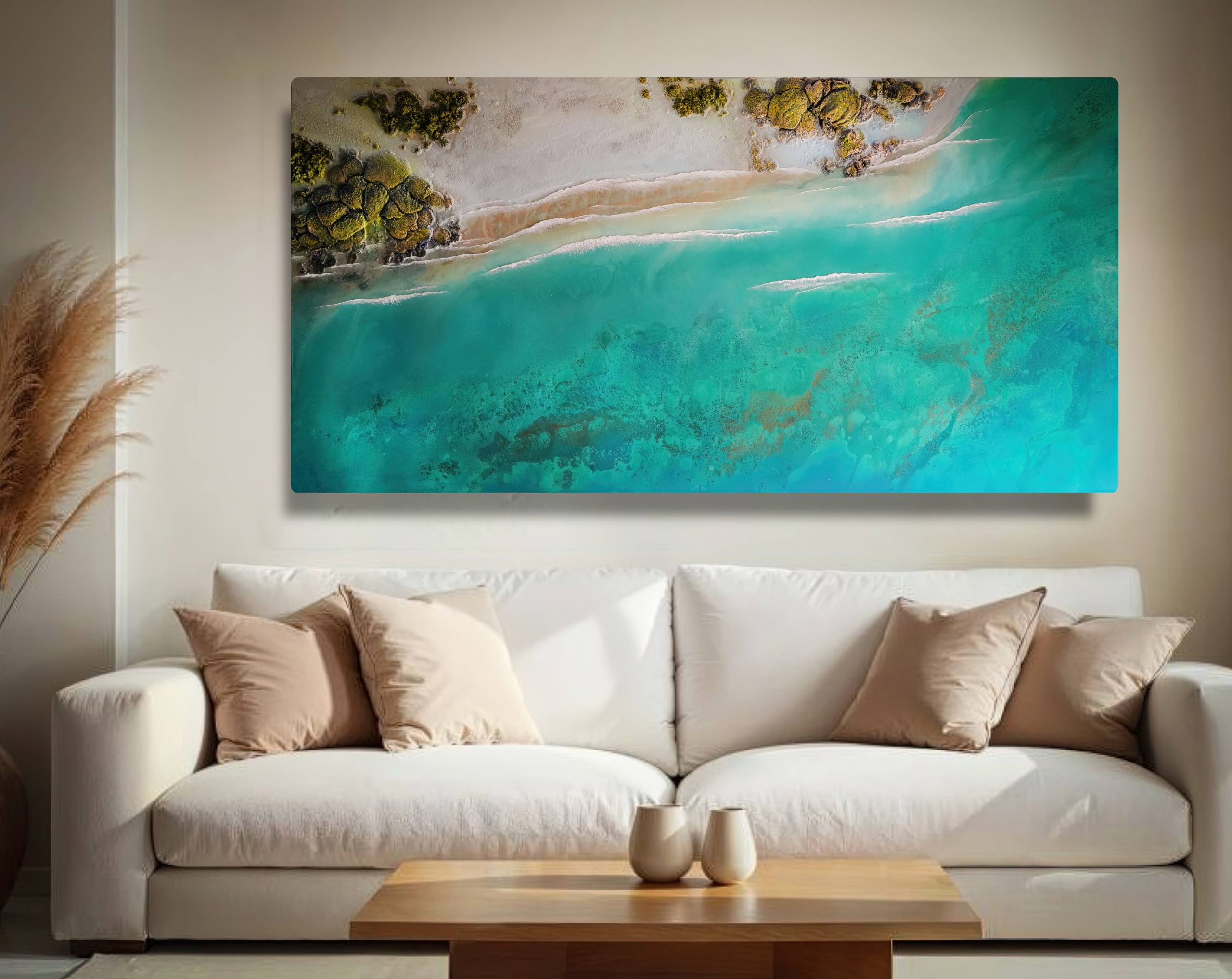 This is true aerial ocean artwork, made for modern coastal interiors and homes that want to feel airy, calm, and connected to the sea. The palette moves through soft aqua, teal, jade, and sand — colours chosen to work seamlessly with neutral styling, linen bedding, timber, stone, and warm minimalist décor. Its realism and texture give the room a grounded, quiet luxury presence without ever overpowering the space.