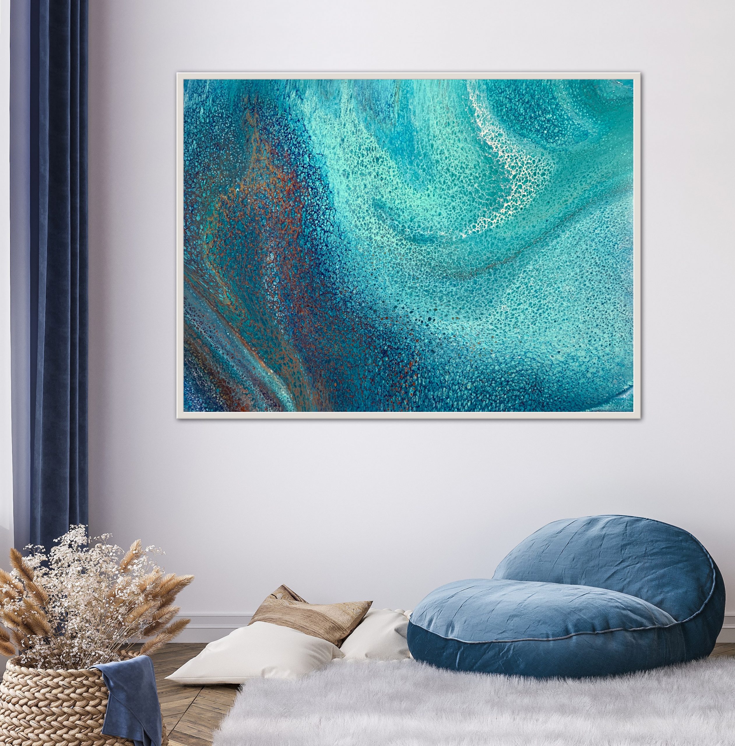 Coral Sea was created using various techniques combined to allow increased flow, interaction and separation of colours to create interesting patterns where pops of colour can be seen emerging from underneath. This added dimension adds lace and cells to the artwork creating an interesting and one of a kind painting that can never be replicated. The metallic paint used reflects the shifting light beautifully really bringing the painting to life.