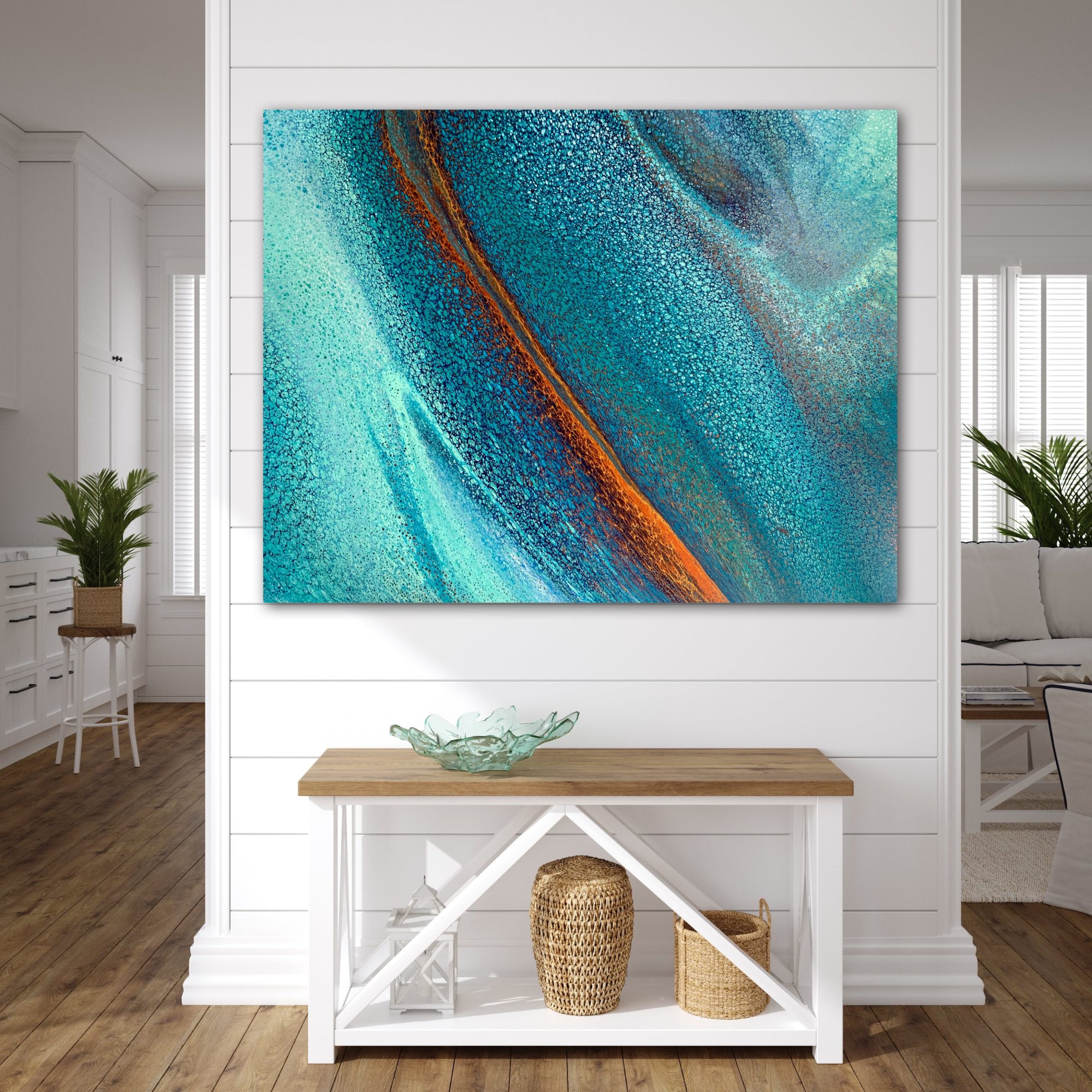 Coral Seas was created using various techniques combined to allow increased flow, interaction and separation of colours to create interesting patterns where pops of colour can be seen emerging from underneath. This added dimension adds lace and cells to the artwork creating an interesting and one of a kind painting that can never be replicated. The metallic paint used reflects the shifting light beautifully really bringing the painting to life.