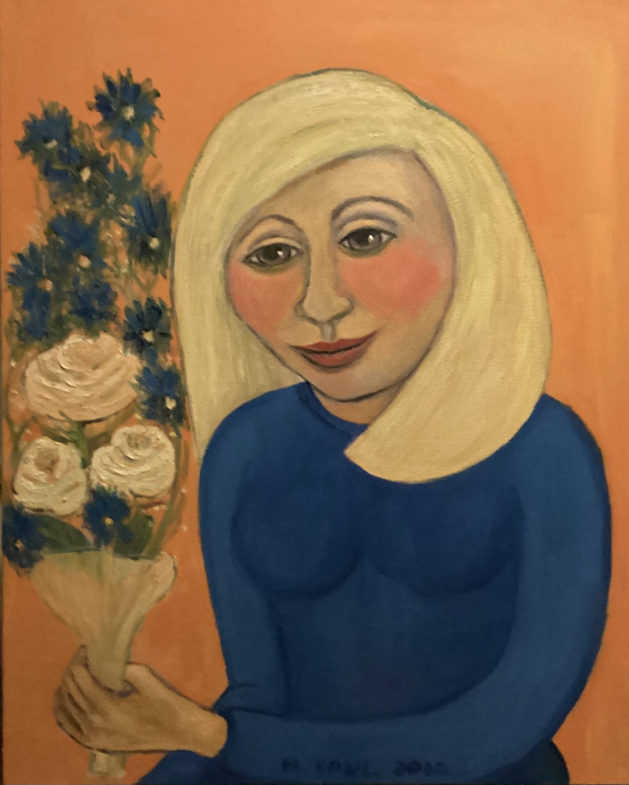 Cornflower and roses – An original oil painting by Margaret Connell.Oil paint and canvas of high quality.The Italian canvas has been stretched over a frame and primed and the frames has hooks .Ready to hang .The painting is sealed . The painting is I spired by Margaret’s love of depicting the human figure and of the use of contrasting colours that enhance each other . Here orange and blue are used in the image of a fair haired female holding an arrangement of cornflowers and roses .The painting is warm and colourful and would lift the ambience of a room .