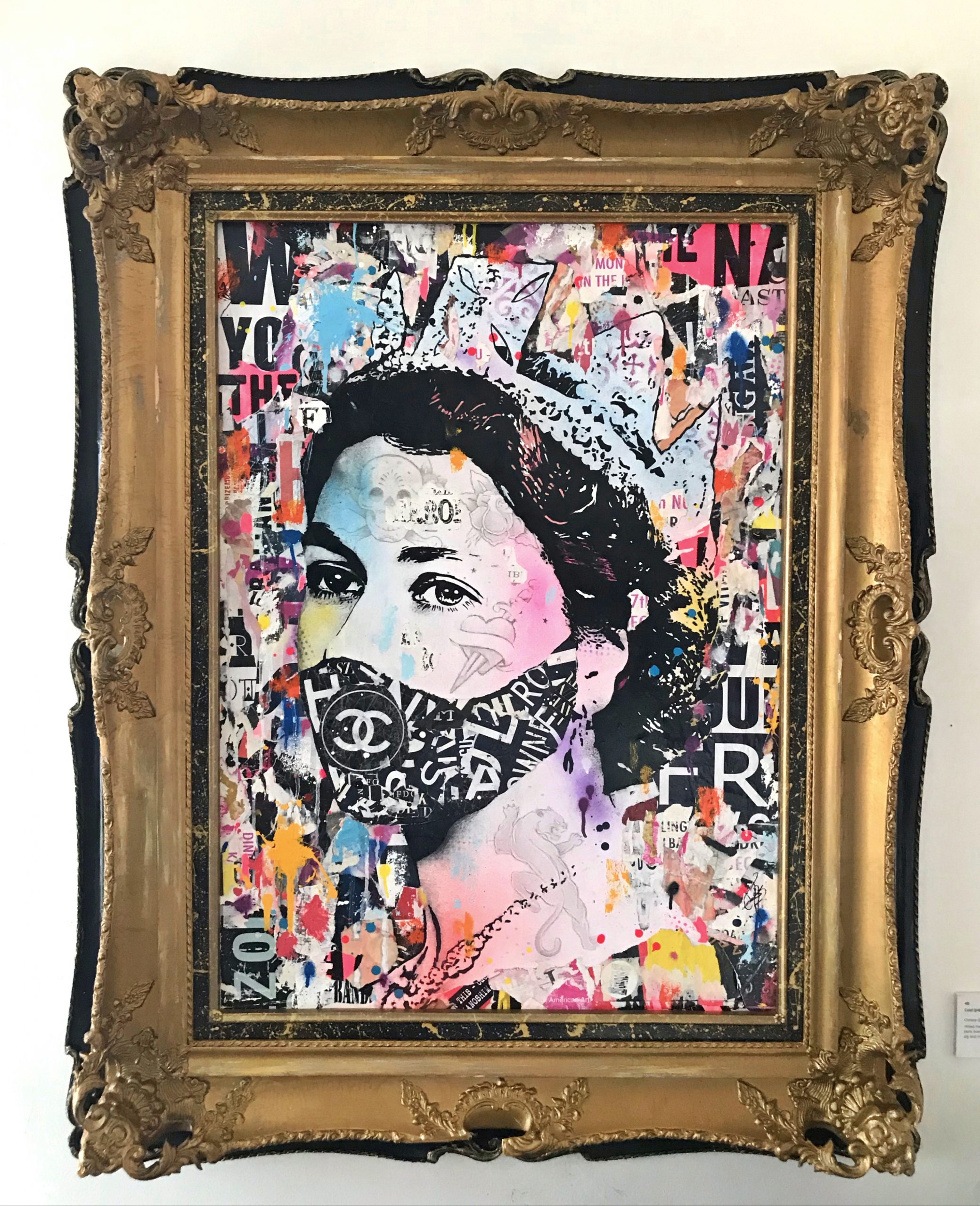 The background was built up with layers of paint and paper before the main Collage of The Queen was then sketched on with Paint Pens and further overlaid with paper and paint and given the essential fashion accessory in 2020 a face mask.