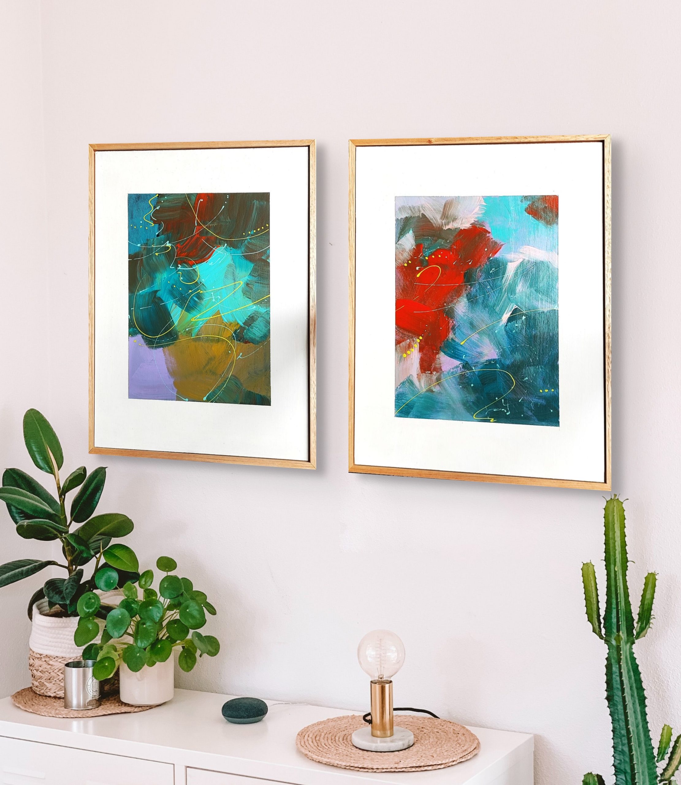 Cosmos 1 and 2 by Steve Tyack – Still feel like that trip to Mars? Maybe this is what you will see. Thes abstract pieces transport you to the vastness of outer space, where colors collide and dance in a cosmic ballet. Bold reds and tranquil blues swirl together, evoking the energy of distant galaxies. Playful yellow accents weave through the composition, adding a sense of whimsy and guiding the eye across the canvas. Each layer reveals a story, inviting you to explore.