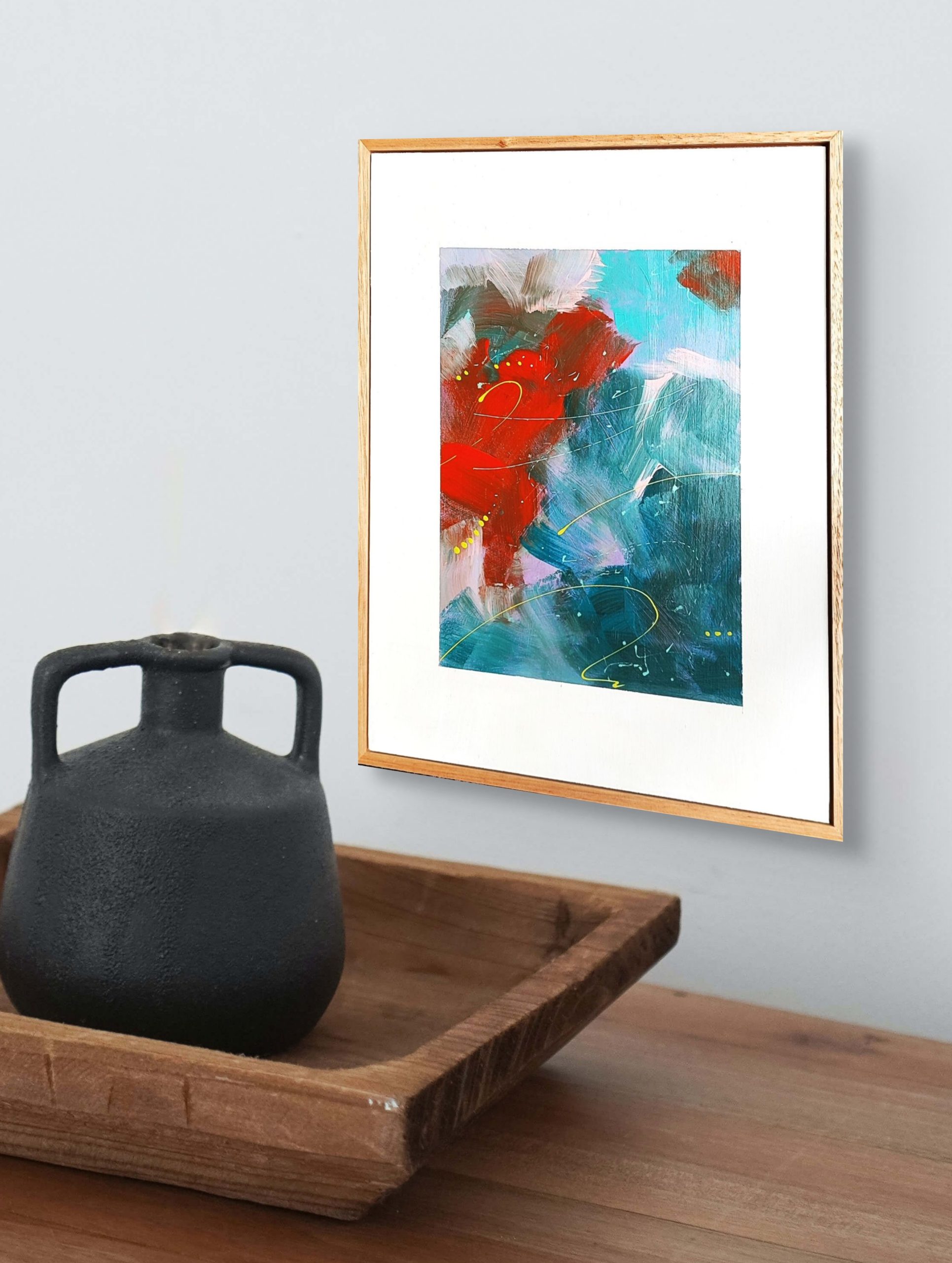 Still feel like that trip to Mars? Maybe this is what you will see. This abstract piece transports you to the vastness of outer space, where colors collide and dance in a cosmic ballet. Bold reds and tranquil blues swirl together, evoking the energy of distant galaxies. Playful yellow accents weave through the composition, adding a sense of whimsy and guiding the eye across the canvas. Each layer reveals a story, inviting you to explore.
