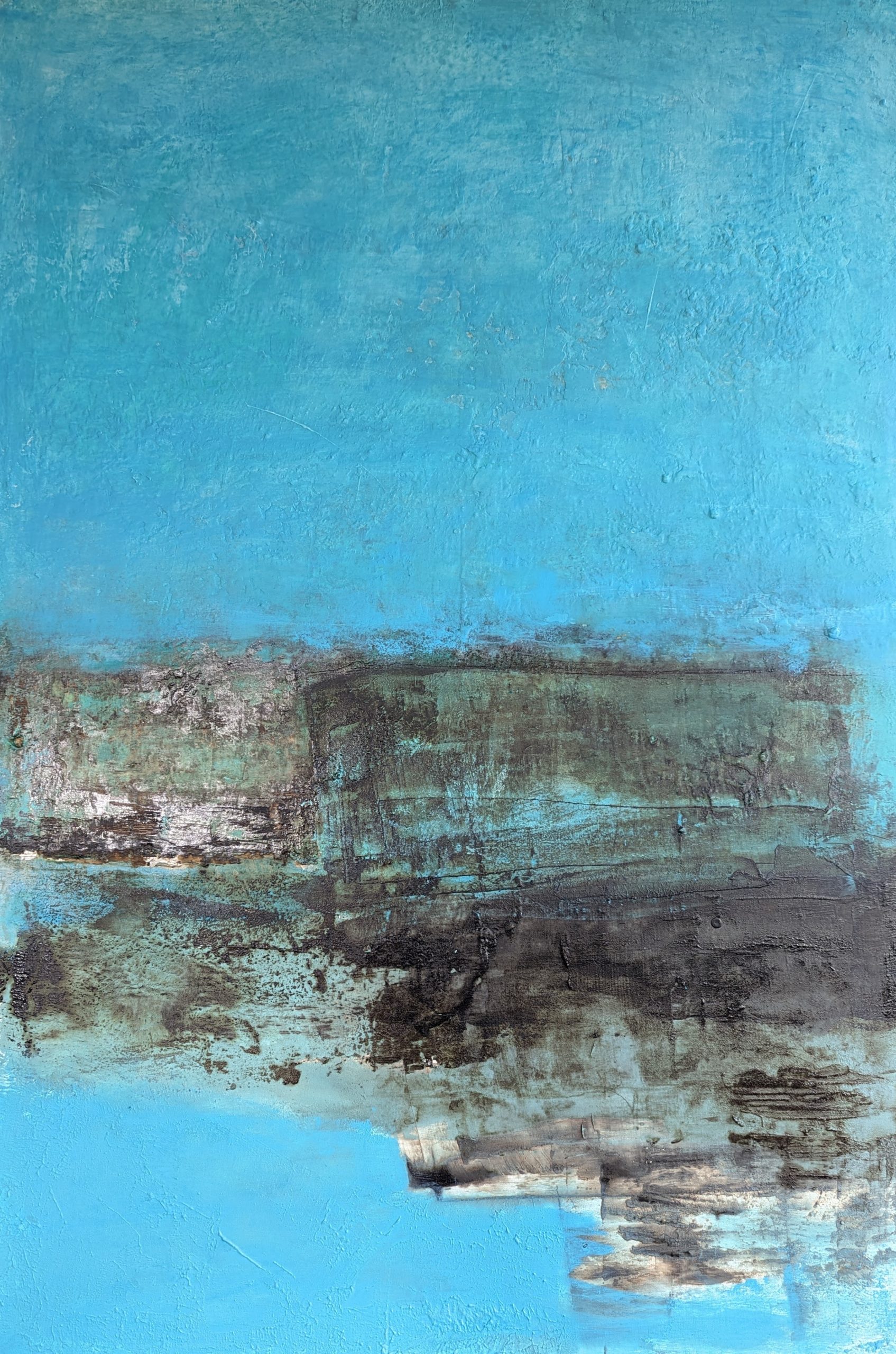 This piece evokes the rugged, elemental beauty of the Costa Brava coastline in Spain, where I live part of the year. Expanses of luminous blue dominate the composition, echoing the open sky and Mediterranean waters—serene yet shaped by time and tide. Along the lower half, layered bands of earthy browns and muted charcoals suggest rocky cliffs, eroded seabeds, and ancient coastal walls, bearing the marks of wind, salt, and memory.