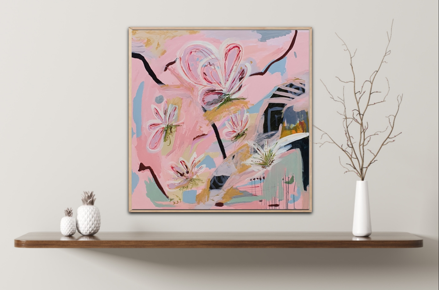 This is a fresh and colourful painting inspired by nature and the outdoors. expressive brushstrokes, this is a mixed modern and Art Deco painting. soft pastel calming landscape inspired by summer sunsets and Wild Flowers.