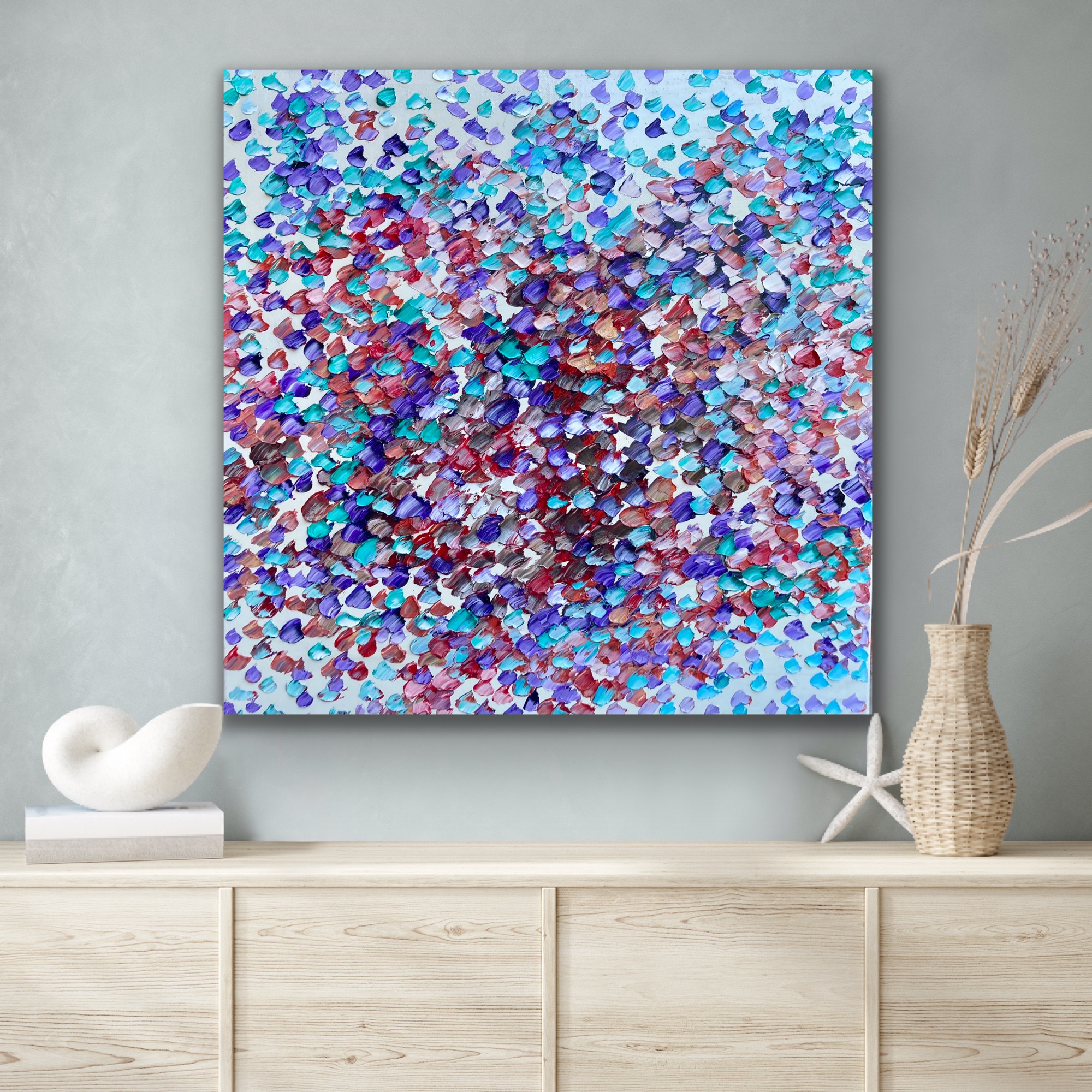 Count your Blessings a painting of beautiful coloured petals weeping on to the landscape. Petals are painted in thick rich oil paints with a pallet knife to capture the richness of the colours of the petals and to give a lot of depth to the painting. Weeping petals in the Sky creating a veil of colours, dancing like musical notes. Every petal has its own beauty with so much texture and movement. Hope with this s work it makes the viewer feel very peaceful and tranquil.This painting is signed and dated 2021 at the back of the painting and comes with a certificate of Authenticity.I