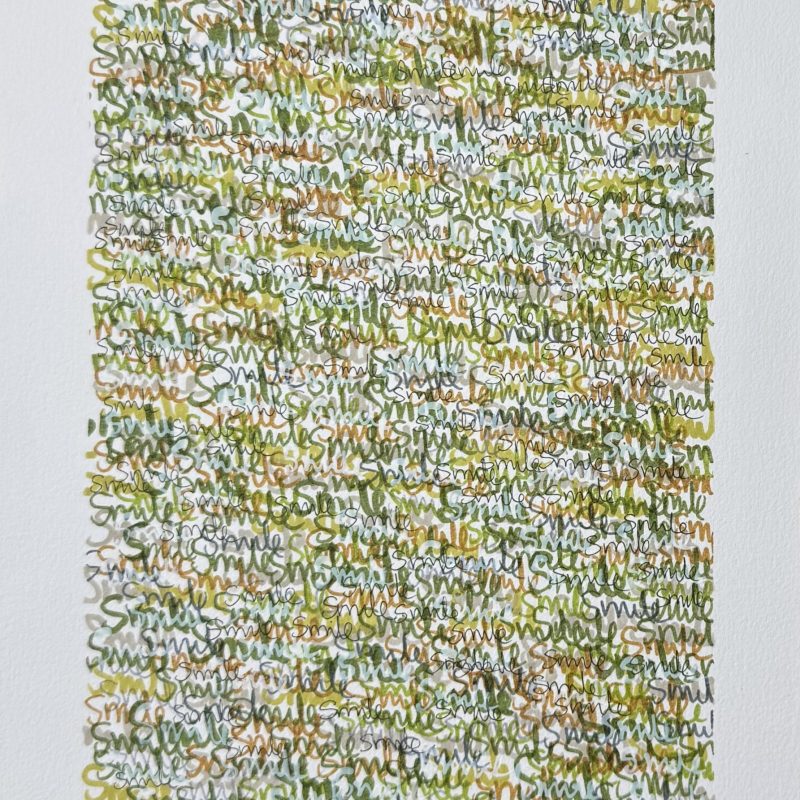 This large painting has areas of texture and gestural marks in paint and pencil across the canvas surface. It’s striking palette consists of white, green, olive, dark green and a tiny hint of peach.