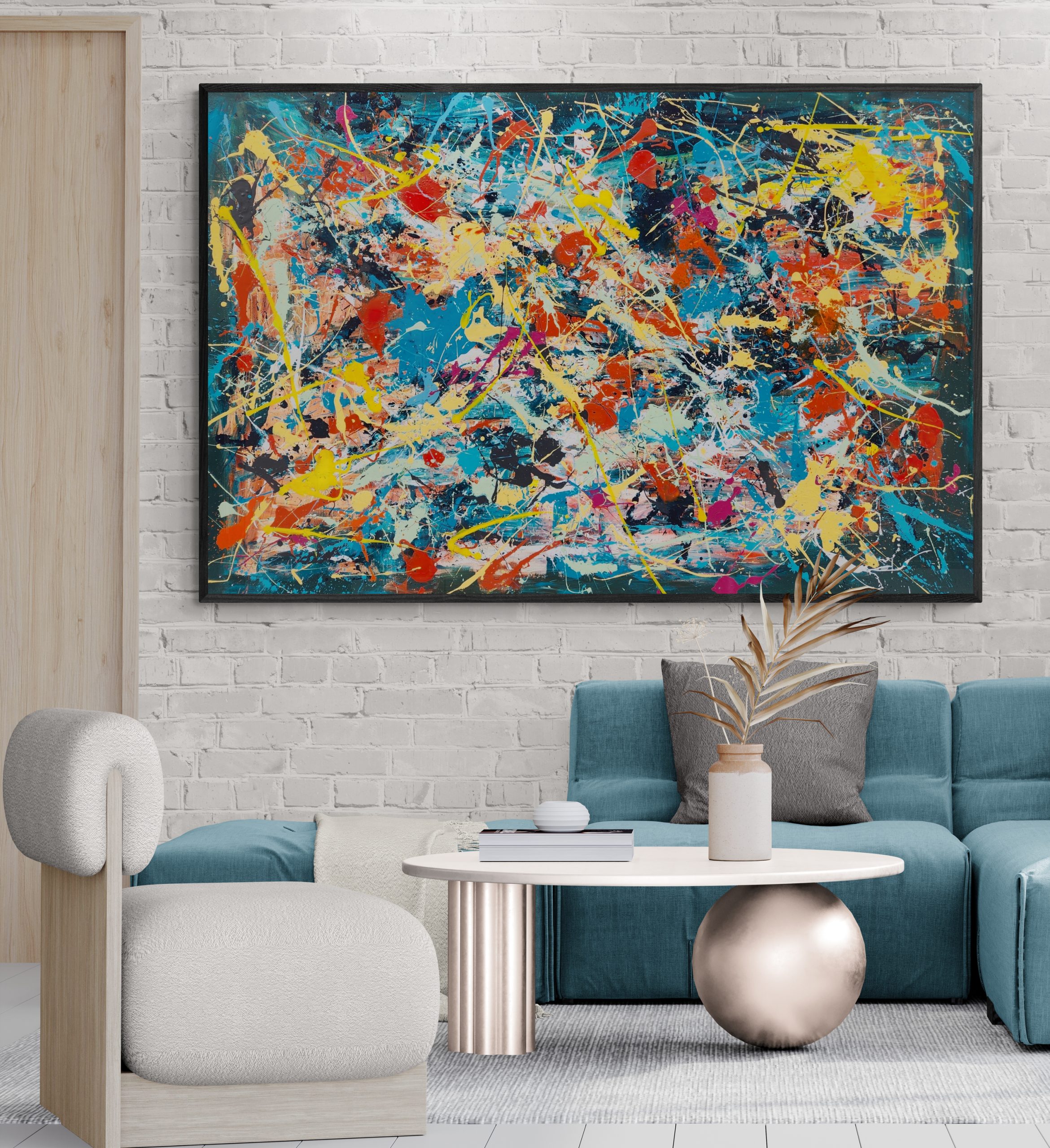 It is an acrylic painting in a wide range of colours, lines and shapes, made by the method of dripping and pouring paint onto a canvas.