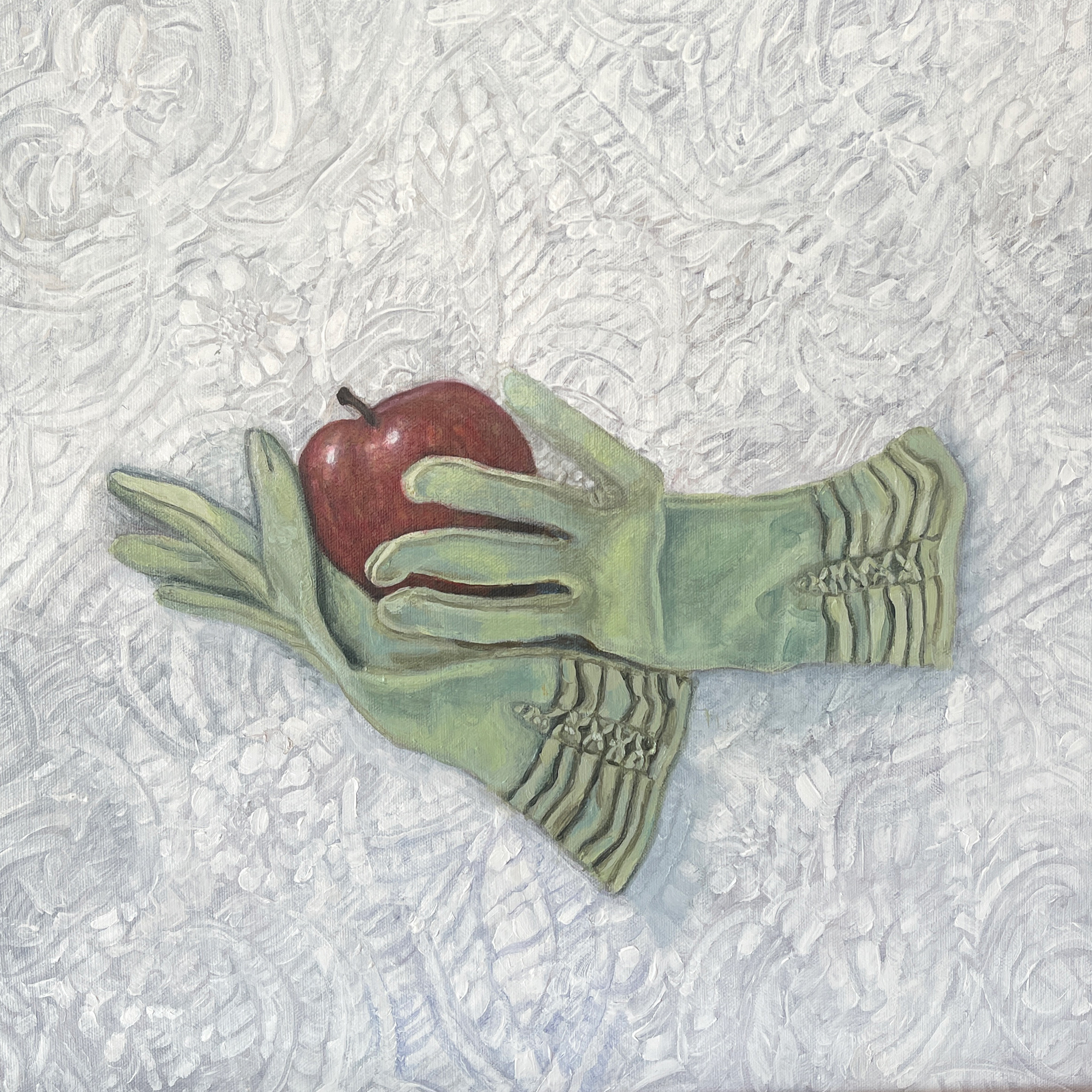 A pair of vintage opera gloves appear to be holding a shiny red apple. But the owner of the gloves does not appear to be anywhere in the painting. Resting on a richly textured vintage quilt, we seem to be witnessing some kind of stolen moment. Perhaps the most pertinent symbolism of the Apple in this vignette is that of forbidden fruit or fertility. The Apple is perfect, shiny and red. The gloves are from the past, they have not been worn for many years but they are still lovely. Ladies these days  prefer the natural look and a nice manicure.
