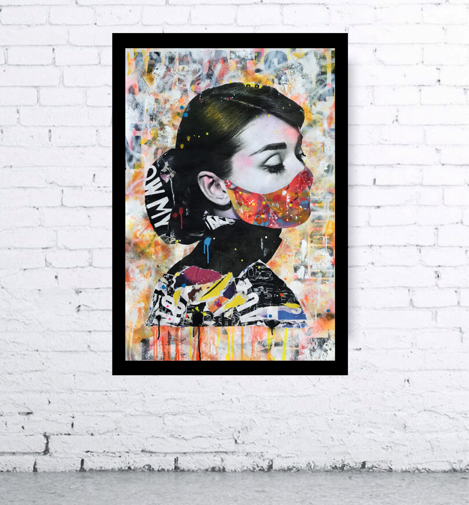 The background was built up with layers of paint and paper before the main Collage of Audrey Hepburn was added and overlaid with paper and paint and given the essential fashion accessory in 2020 a face mask.