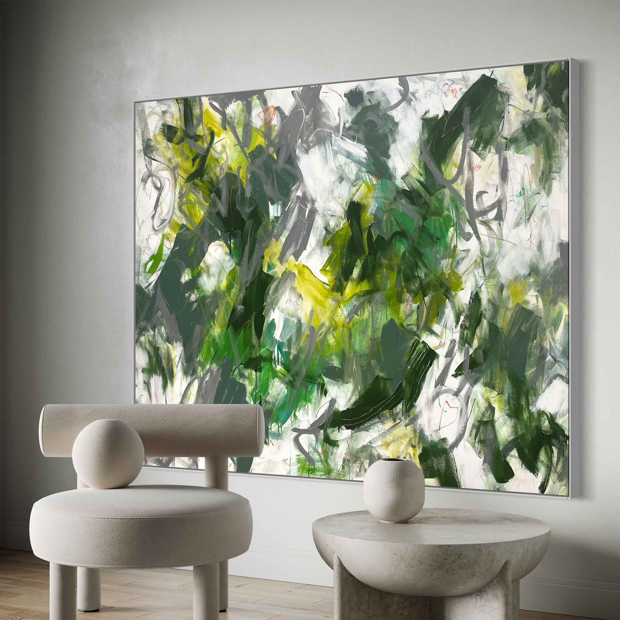 This stunning piece combines complex mark making and texture with a beautifully balanced palette of white, beige and neutral tones mixed with areas of light green, grey, dark green sage and olive with pops of orange, apricot and peach.