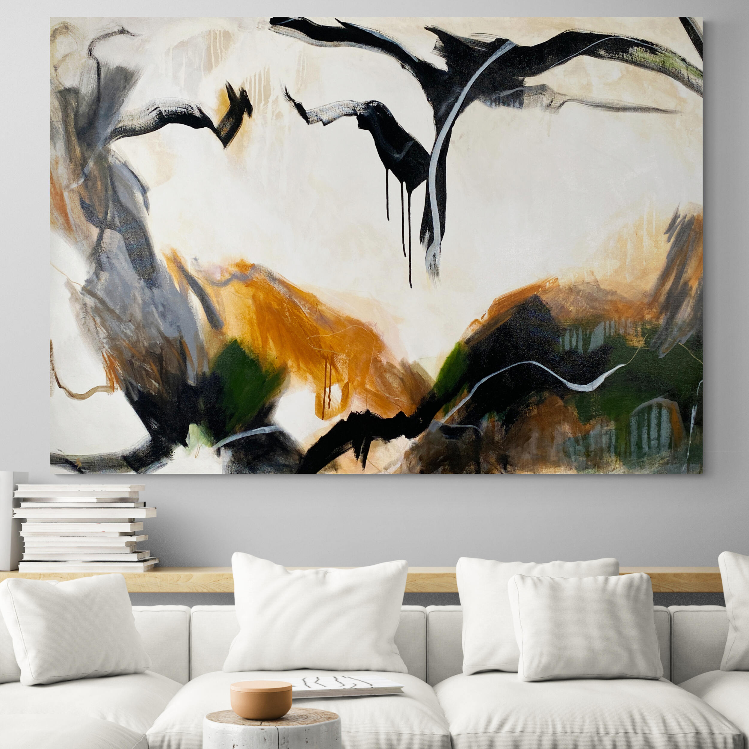 Crazy Heart is a vibrant statement painting perfect for any large space. Its striking palette of light green mixed with rich ochre, beige, grey, and earthy tones ties together beautifully against areas of black and white which makes this piece come alive.