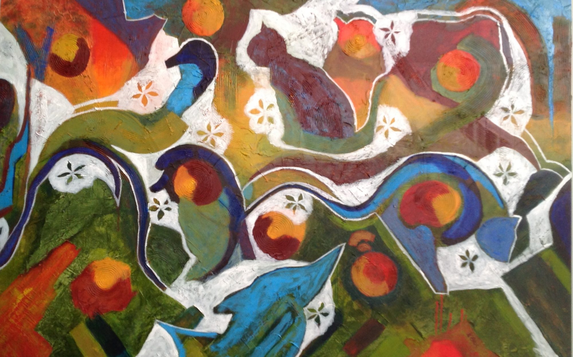 This large super bright textured abstract landscape filled with happy playful creatures (including a few native animals and a few nocturnal ones) provides companionship, comfort, memories, curiosity, intrigue and warmth to the viewer throughout the day and the night. I have spotted a cat, possum, penguin, emu, dolphin and owl in the painting. They seemed to appear out of nowhere as I was painting. Can you see anymore?