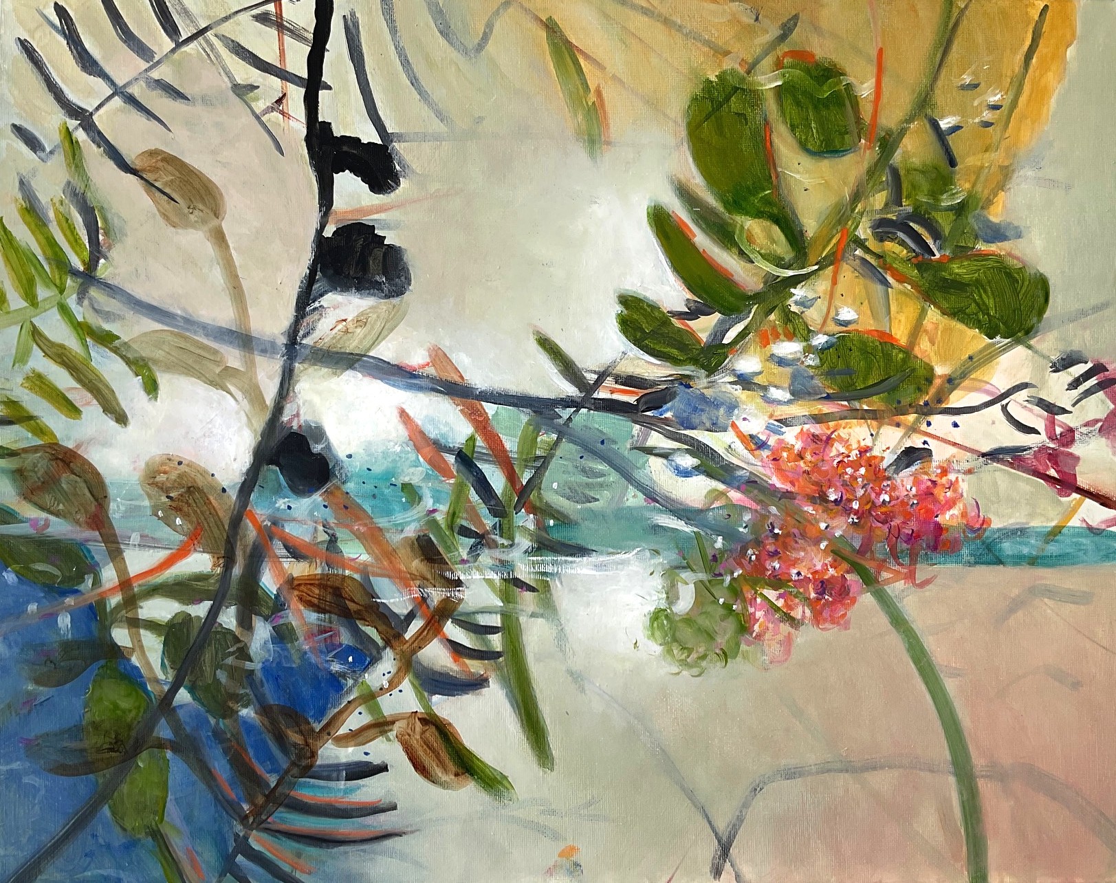 “Creek patterns” by Dianne Smith is inspired by fleeting moments where sparkling sunlight interacts with a mix of leaves, plant fragments and sunlit dots forming abstract patterns on the surface of water. I am fascinated by the subtle interplay between light, foliage and water.