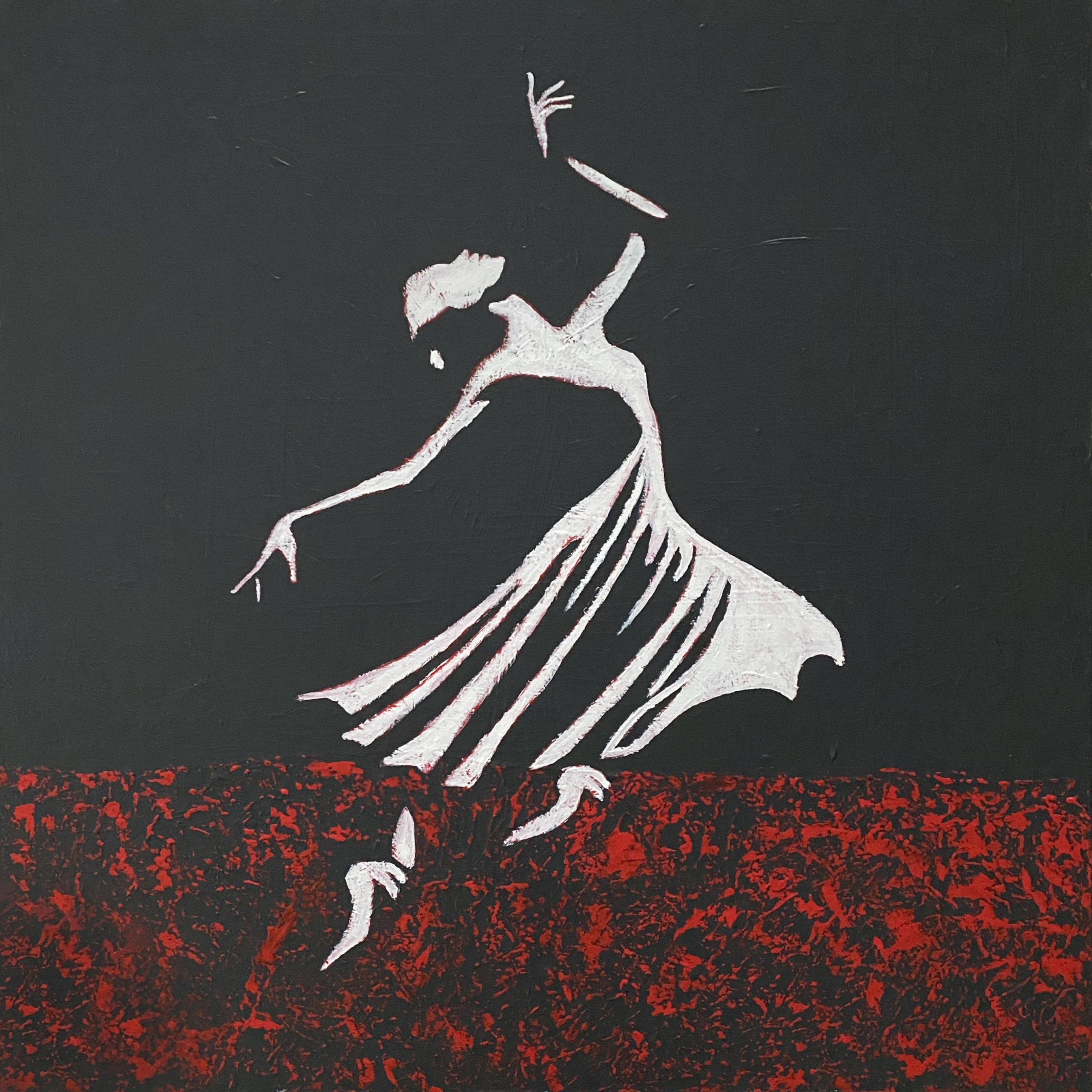 Featuring subtle red highlights underneath the white, the figure’s grace and elegance contrast with the deep red textured ground, which can be interpreted as passion, intensity and energy.