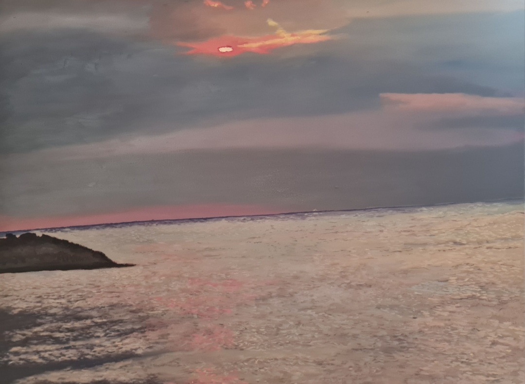 Crimson Reflections by Sam Brett – This painting captures the serene beauty of a coastal sunset, where the sun’s fiery glow reflects across the rippling waves. I wanted to convey the peaceful yet powerful transition of light as it fades into the horizon, blending warm pinks and deep blues into a dreamy seascape. The contrast between sky, water, and land enhances the depth and tranquillity of the scene, inviting the viewer to immerse themselves in its calm atmosphere.