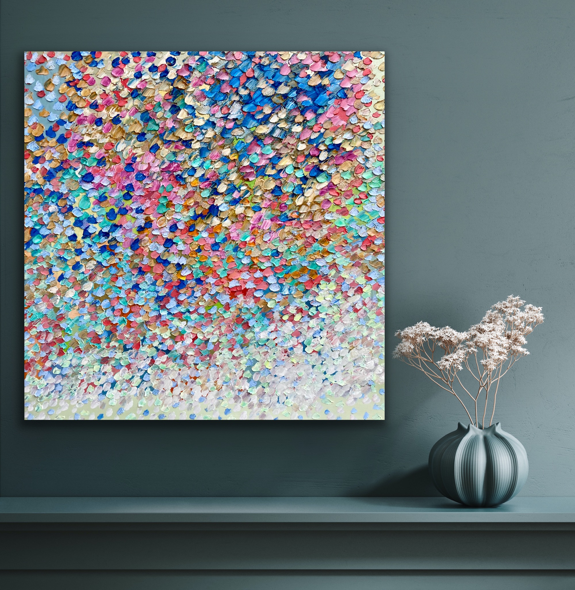 Crown Jewels is a painting of beautiful bouquet of coloured petals weeping on to the landscape. Petals are painted in thick rich oil paints with a pallet knife to capture the richness of the colours of the petals and to give a lot of depth to the painting. Weeping petals from the forest creating a veil of colours, dancing over the land .Hope with this s work it makes the viewer feel very peaceful and tranquil. This painting is signed and dated 2021 at the back of the painting and comes with a certificate of Authenticity.