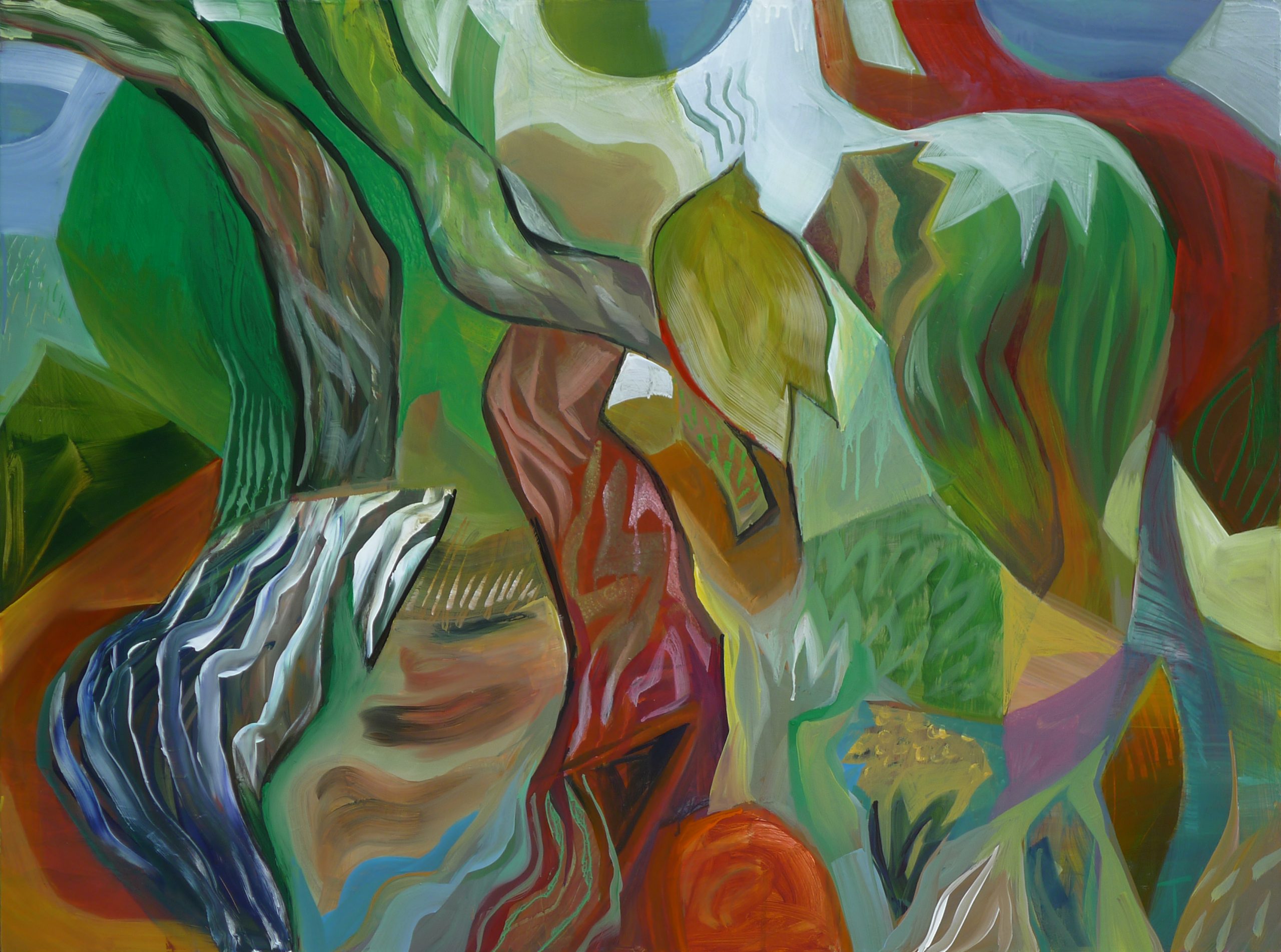 Leaves whisper in tongues older than speech; not a call for help, but a remembering; not a curse, but a becoming. A bower often symbolises shelter, femininity, or inner sanctuary and a bower in the natural world is often associated with birds — specifically Bowerbirds, known for their intricate courtship nests. The style is deeply abstract, verging on lyrical abstraction and expressionism. It blends personal psyche with archetypal myth, thus allowing viewers to project their own narratives onto its fertile surface.