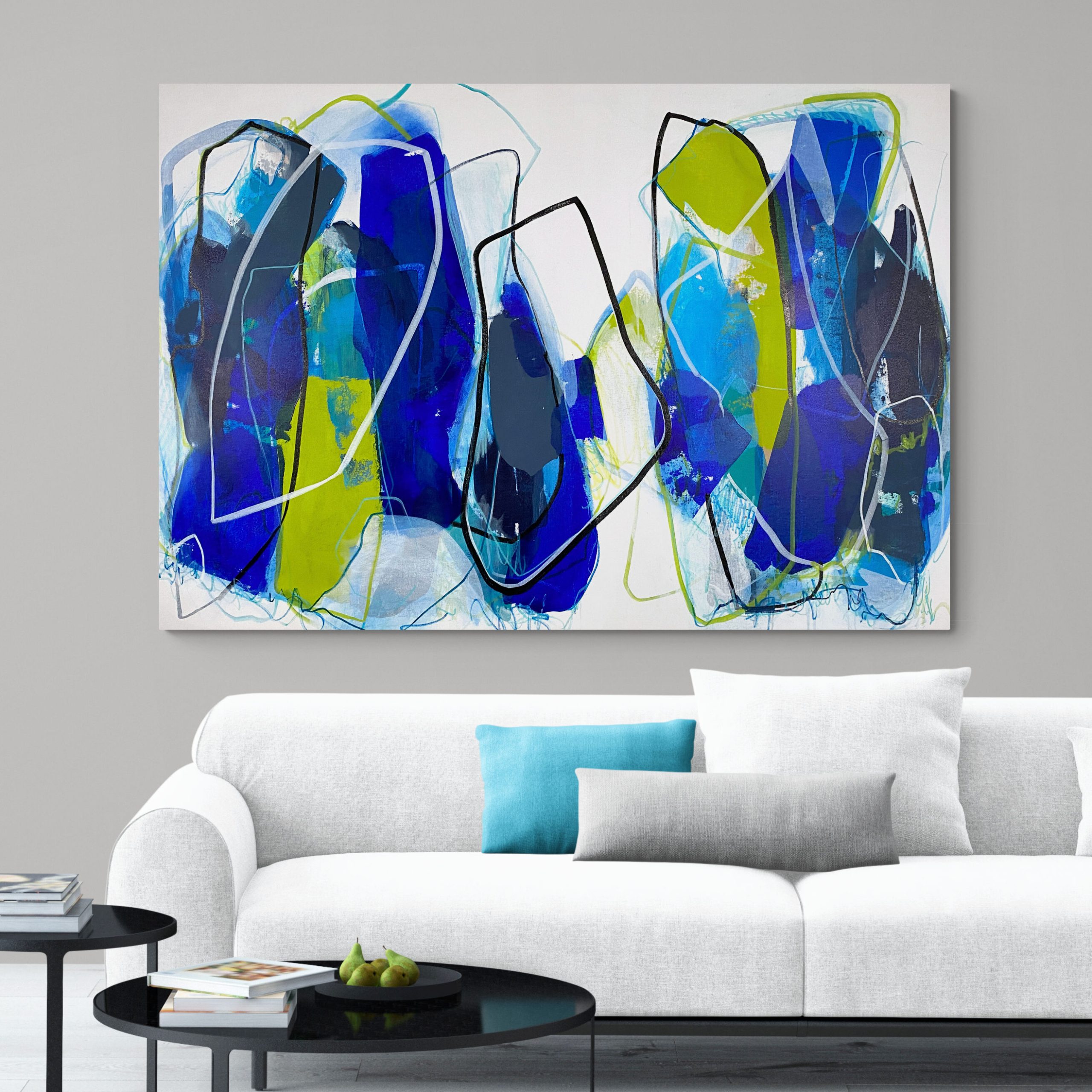 The striking mark making in this large artwork combined with its vibrant seascape palette of dark and turquoise blues, greens, tan, black and white would make the perfect statement piece for any space.