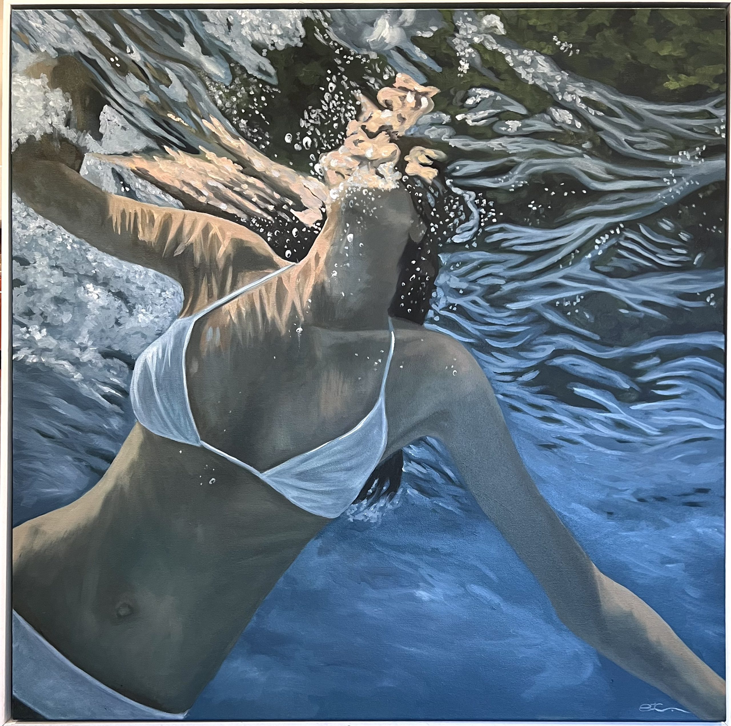 Crystalline by Amanda Cameron – One of my ‘Summer Series’ of paintings and is an investigation into the interaction and connection between perspective, realism and colour. Amanda’s work is focused on the quest for finding refuge, quietness and escapism. Some [paintings] focus on the lone swimmer, the few minutes of introspection when submerged in the warm quiet of water, and others investigate the interaction of people within various aspects of the landscape. I haven’t settled on any particular style, and constantly struggle with the juxtaposition between hyper-realism and having a painterly quality to my art and this conflict in my paintings is what I am always trying to balance. This piece is painted in professional quality oil paints on a museum quality canvas, and finished with edges painted and a gloss varnish for protection. It comes ready to hang with a white floating box frame and includes a certificate of authenticity.