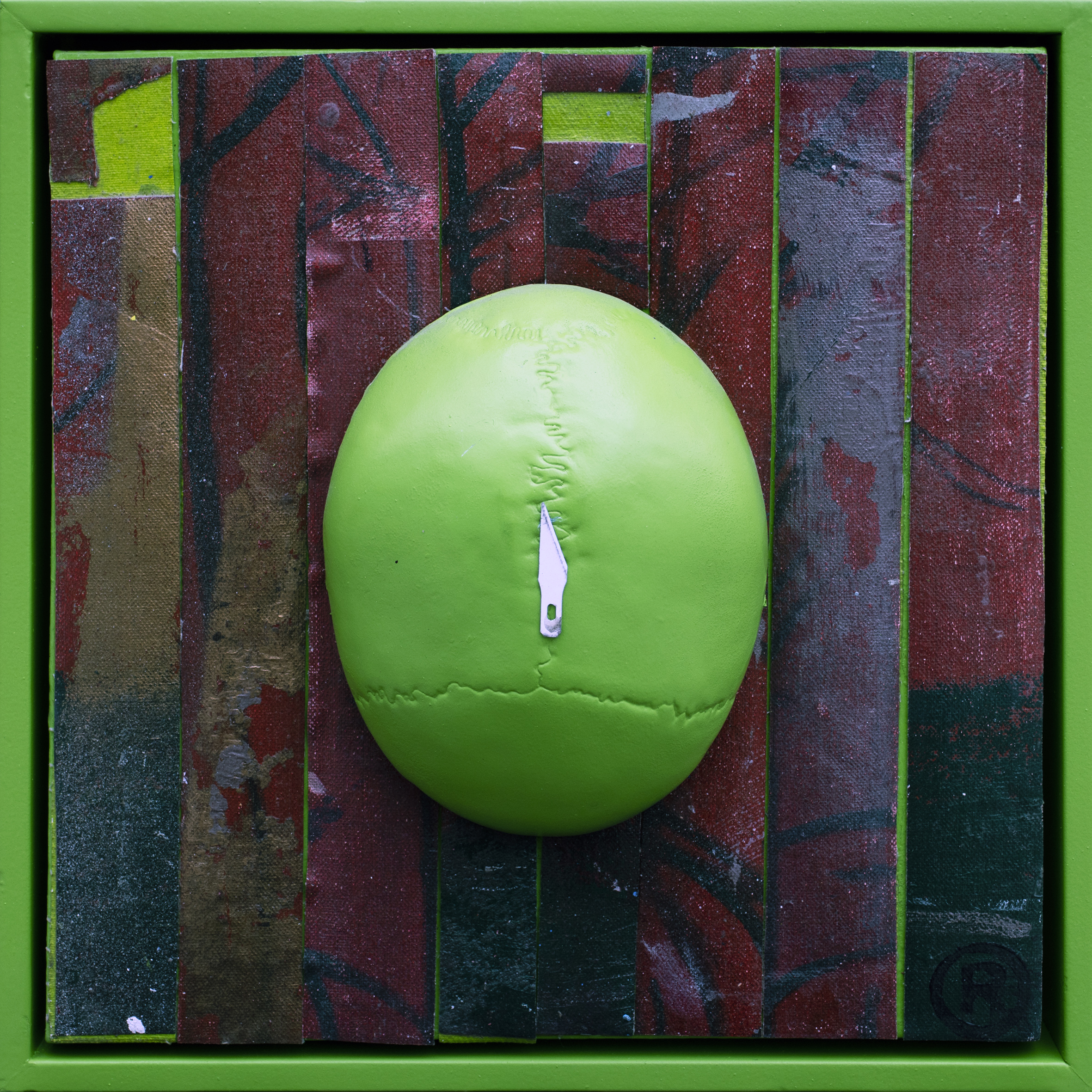 Mixed media – Acrylic, spray paint, skull top, blade and collage on canvas