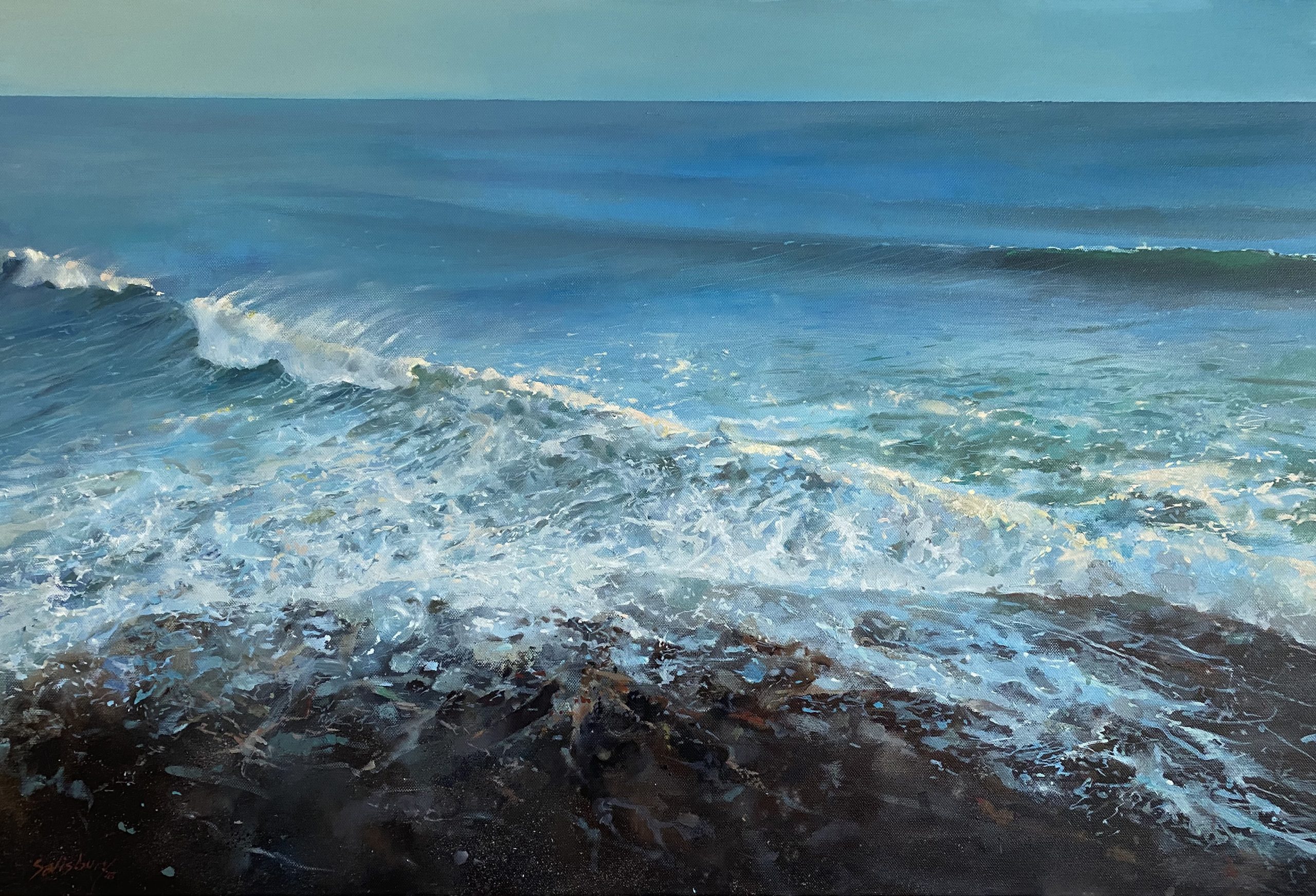 “cylinder beach early morning” is a work created from my many early morning hours sitting on the rocks at cylinder beach. Light on water always captivates me. I try and create those strong feelings and awe I have.