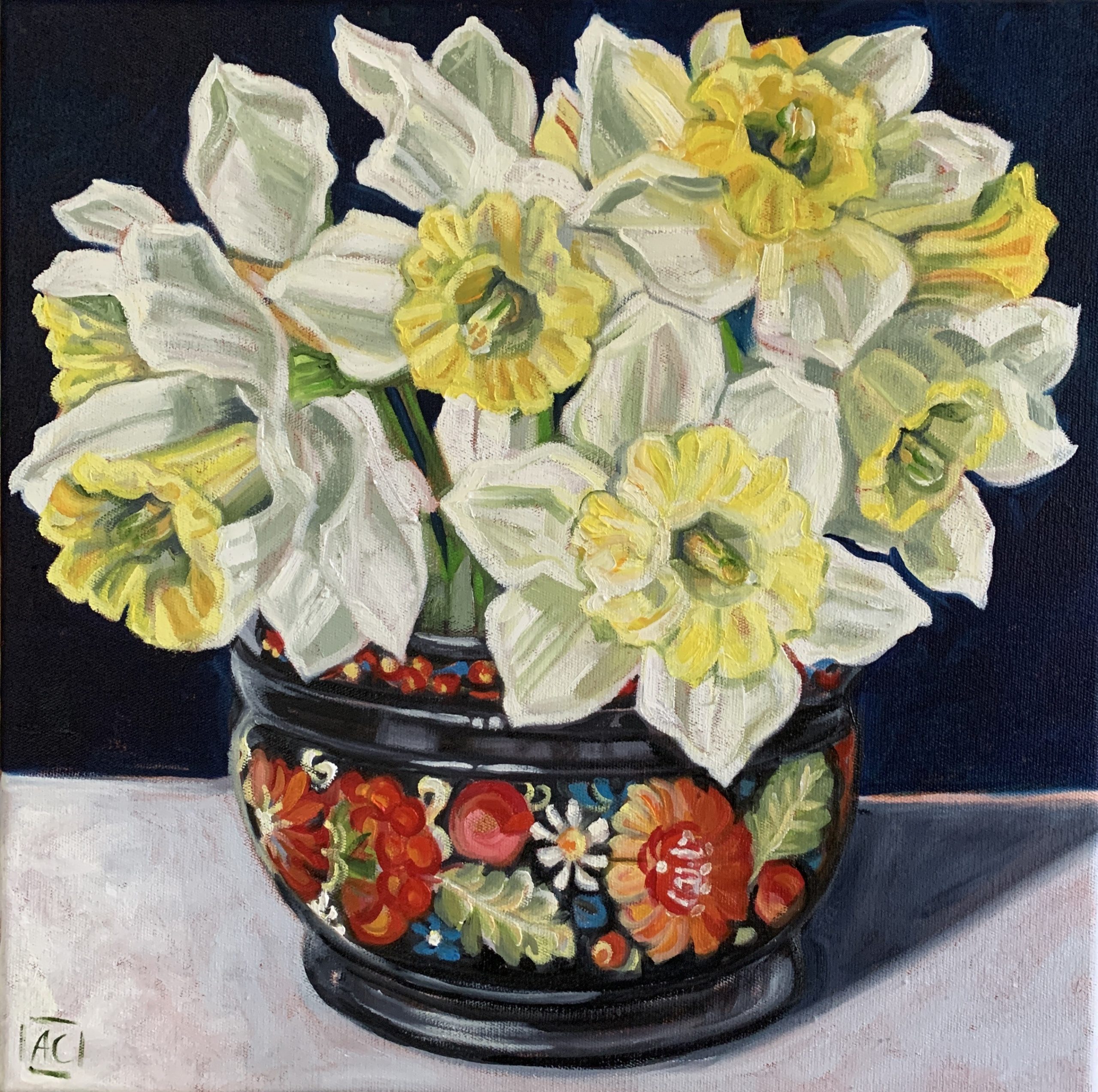 Daffodils in a Russian folk art bowl