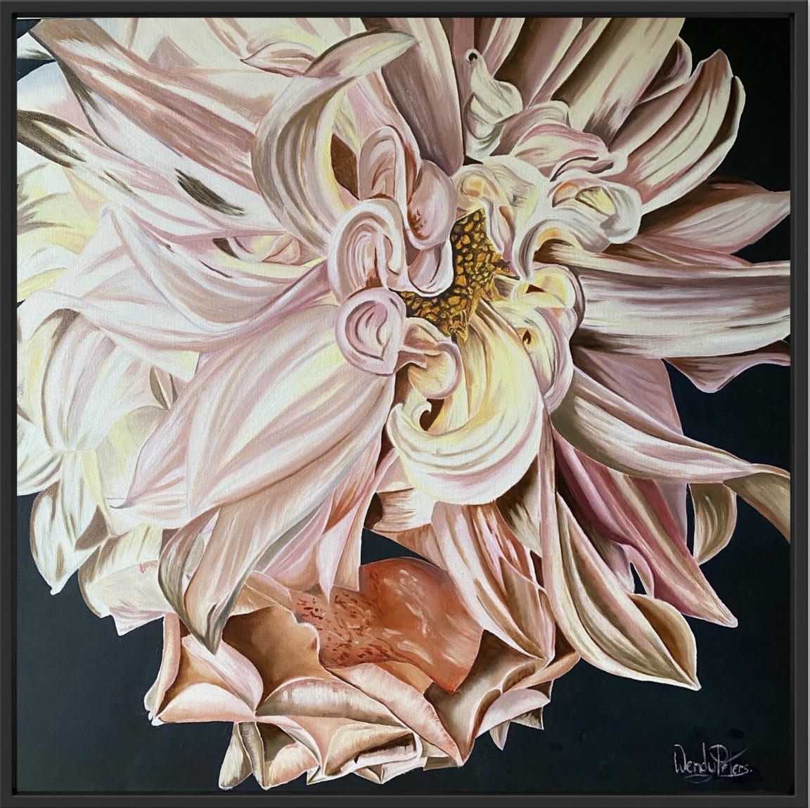 My painting of a Cafe au Lait Dahlia aims to capture the delicate beauty of the flower in full bloom. The flower is rendered in soft muted dusty pinks, with petals that curl and curve. Capturing the intricate details of the flower, from the subtle variations in colour.