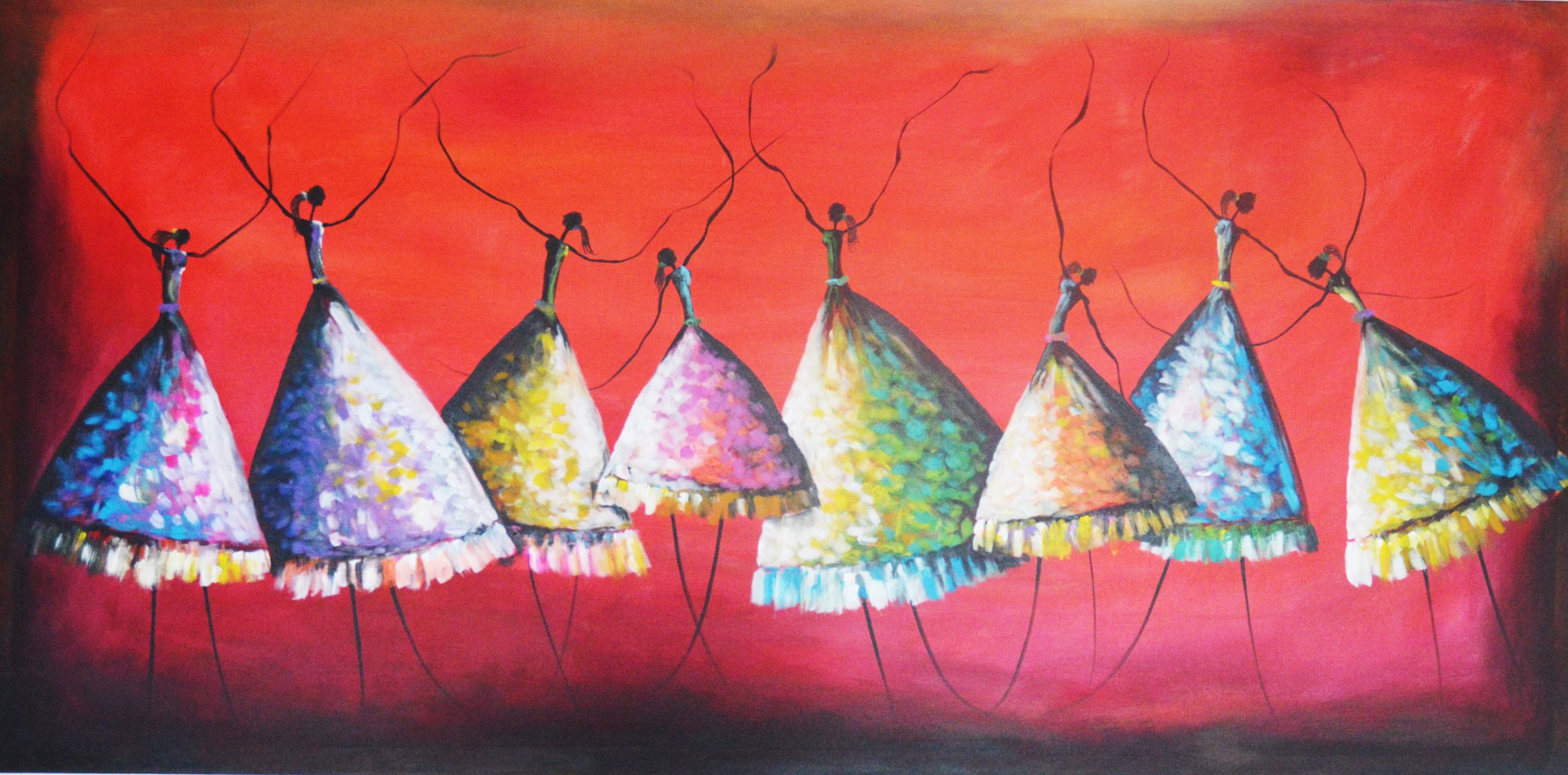 Dancing girls by Mahesh Aluthge – The abstract dancing girls with Spectacular bright colors on the frocks and Maroon color blended background suits for any wall that needs a warm color theme because of the spectrum of the warm and cool color combinations. This beautiful piece will add lot of vibes to any space of any home.