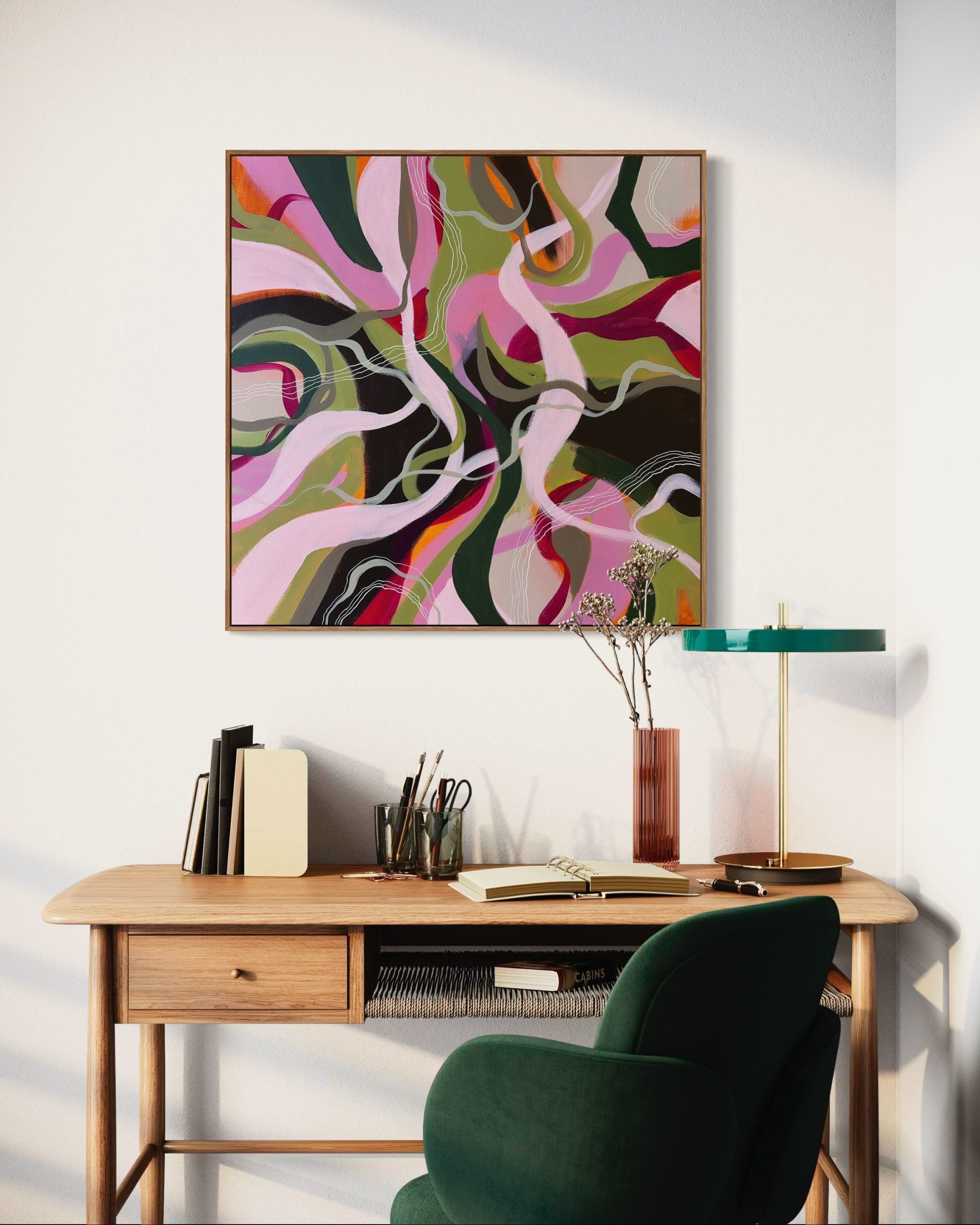 From the series – Organically playful, inspired by the colours of Spring and Summer, luscious pinks, joyful oranges and soothing greens intertwined in organic lines. Bring the feeling of play and fun into your home. Think of the roots and vines growing all over the Australian rainforest, chaotic and beautiful all at once.