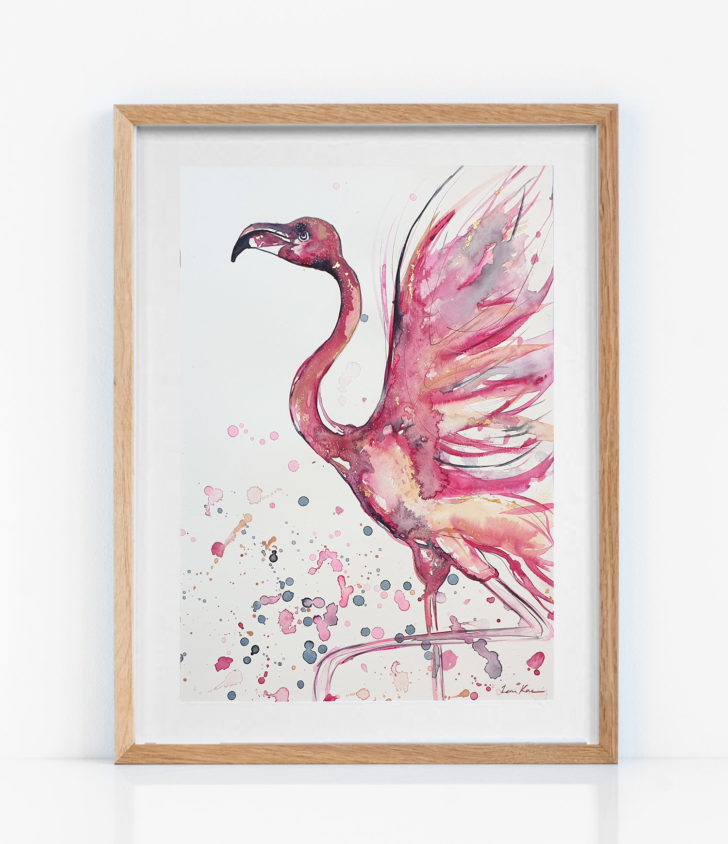 The flamingo symbolises fun and enjoyment. Here it is depicted ‘dancing’, and together with its outstretched wings, speaks of letting go and enjoying the moment with innocent spirit. Painted in watercolour, acrylic paint, and including gold leaf.