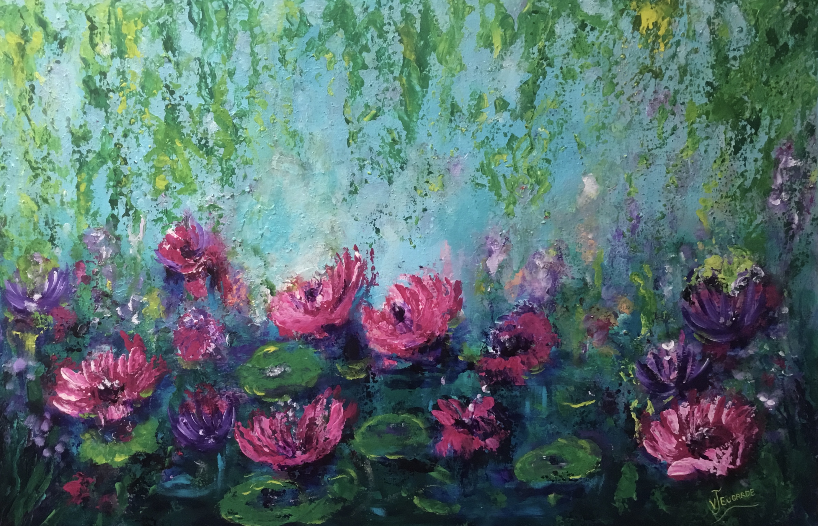 Dance of the Water lily’s represents my impression of a garden pond, there is a small fresh water lagoon close by just near my local park and I was lucky enough to spot the biggest Water Lily’s popping there heads up amongst the green lily pads and the reeds. It is alive with the noise of crickets and frogs and luckily never seems to dry up, I have always loved lily ponds and although Monet was a master of them I think there is always room for one more, one can sit and dream and feel the serenity just watching the water.