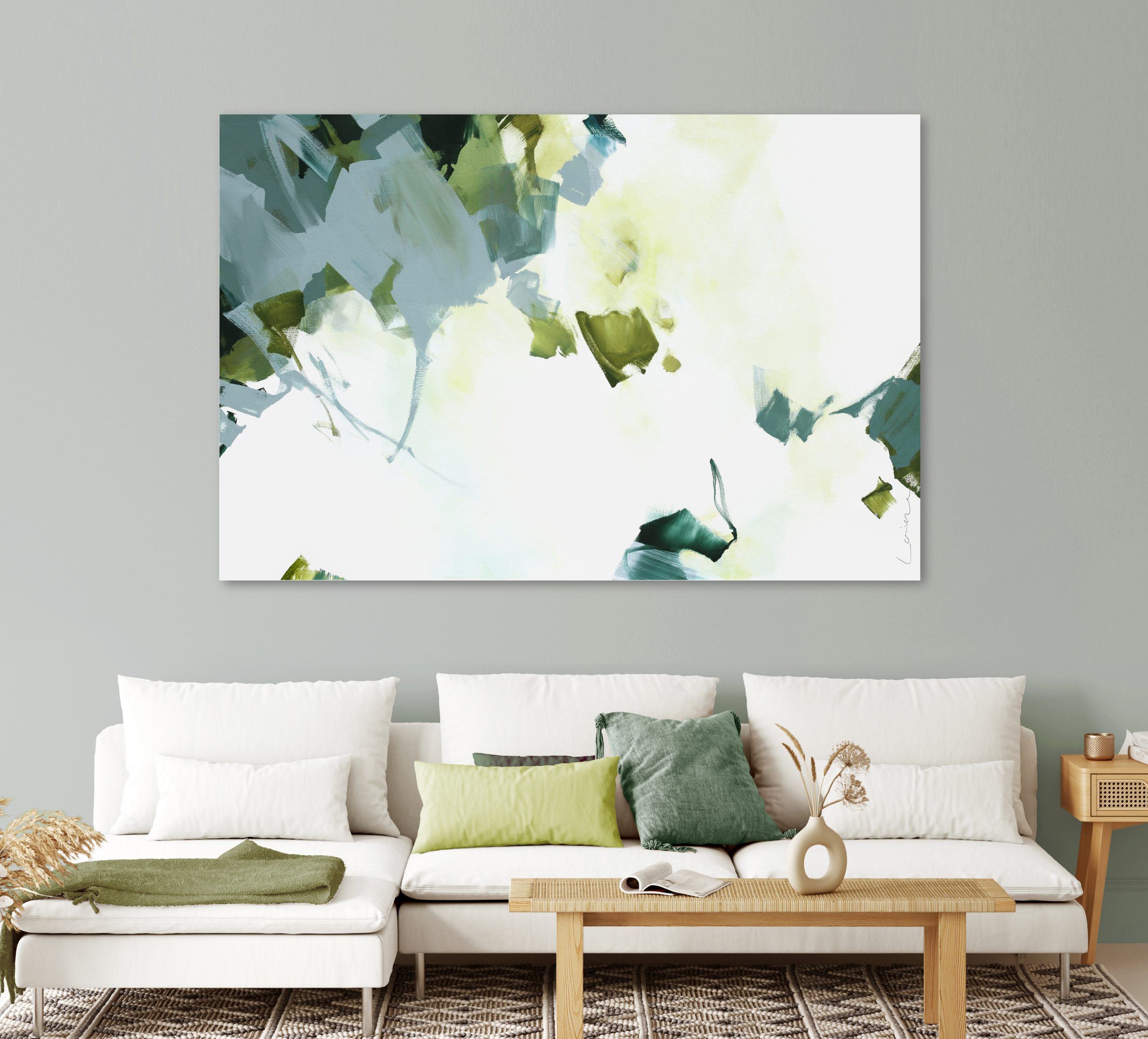 Dance with Hue is a combination of greens, blues, greys and mustard olives and is painted on quality 12oz stretched canvas. He will come rolled in a tube. We can provide a quote for stretching onto a frame or alternatively I can send the canvas to a local framer of your choice for stretching.
