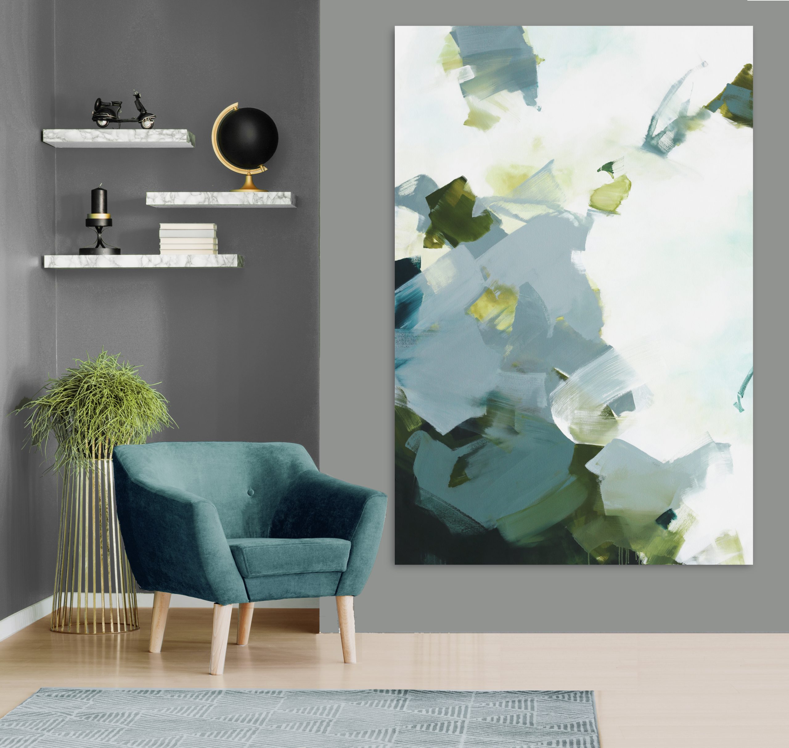 Dance with Me is a combination of greens, blues, greys and mustard olives and is painted on quality 12oz stretched canvas. He will come rolled in a tube. We can provide a quote for stretching onto a frame or alternatively I can send the canvas to a local framer of your choice for stretching.
