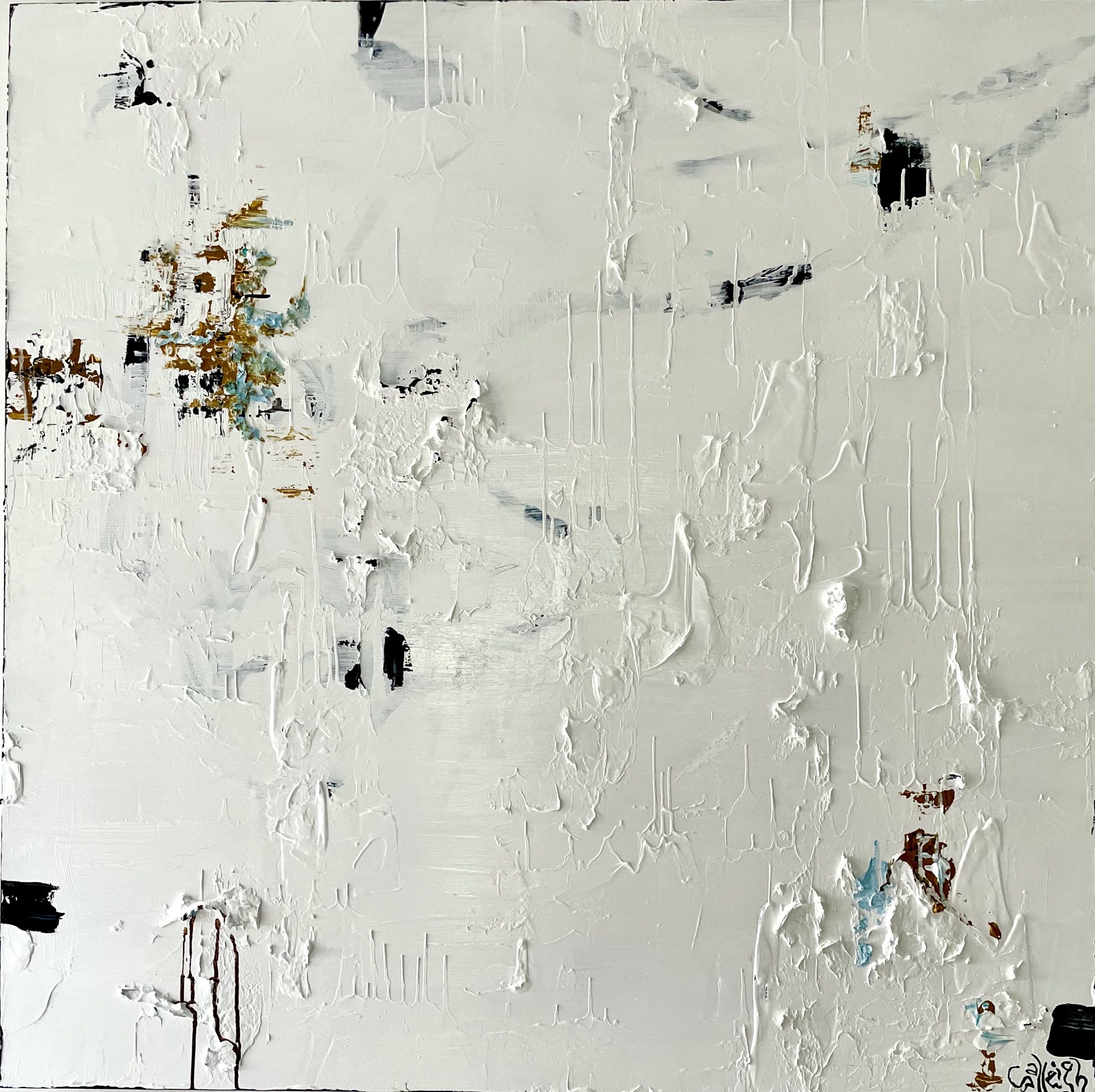 Dancing for the answers by Salleigh Olsen – Â is a textural, original abstract piece. With layers and layers of textural whites creating stories in an interesting eye catching yet calming subtle creation.