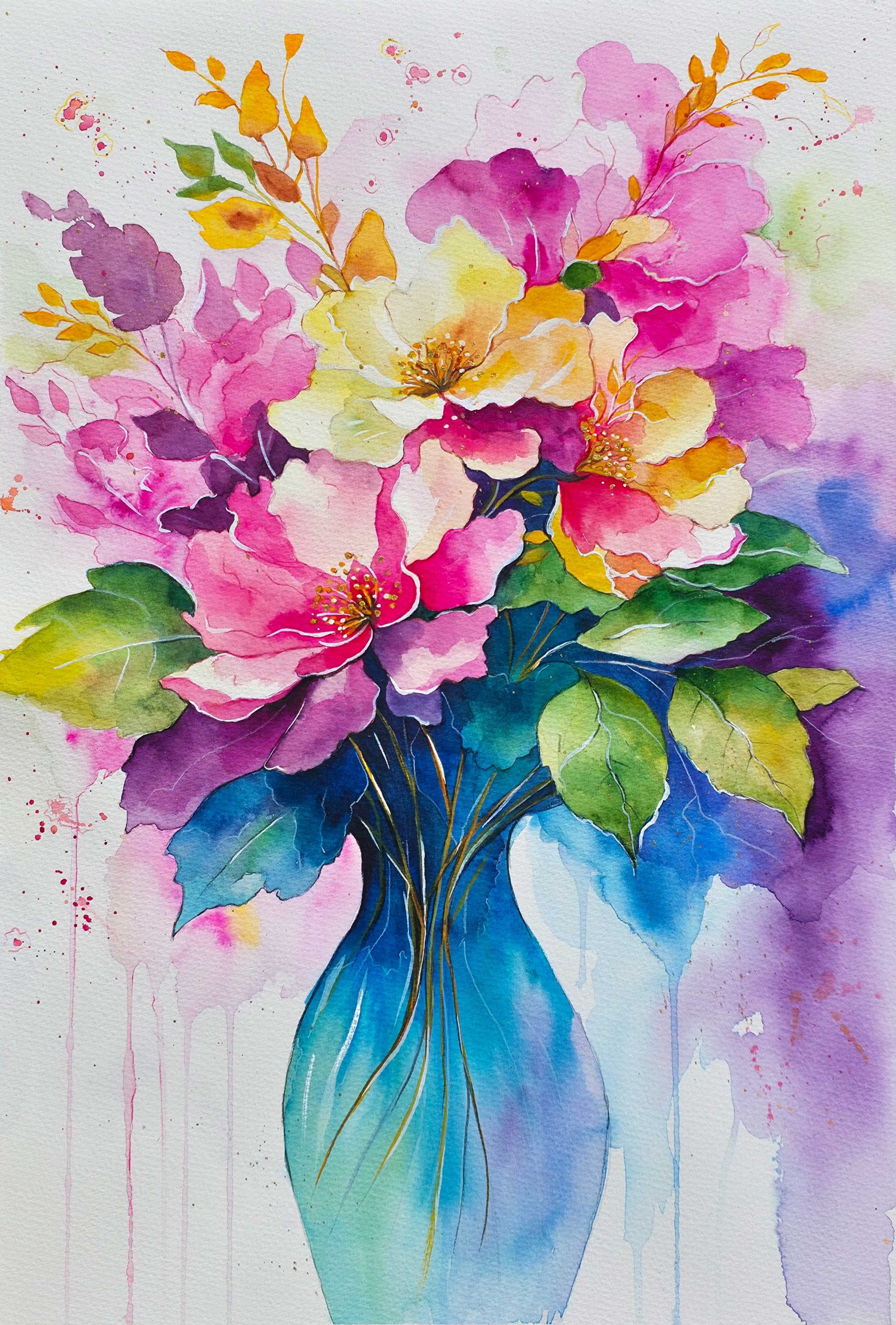 Dancing in Colour by Kay Shanley – A joyful celebration of nature’s palette, ‘Dancing in Colour’ bursts with vibrant florals swaying in a vase of luminous hues. Painted in fluid watercolours, this piece captures the energy and movement of blooms alive with light and colour.