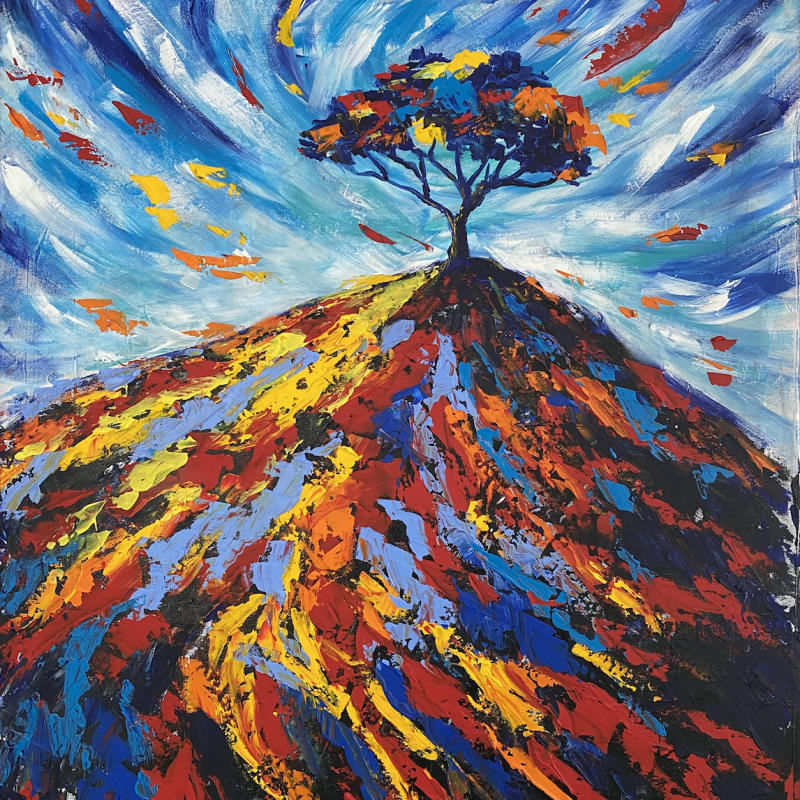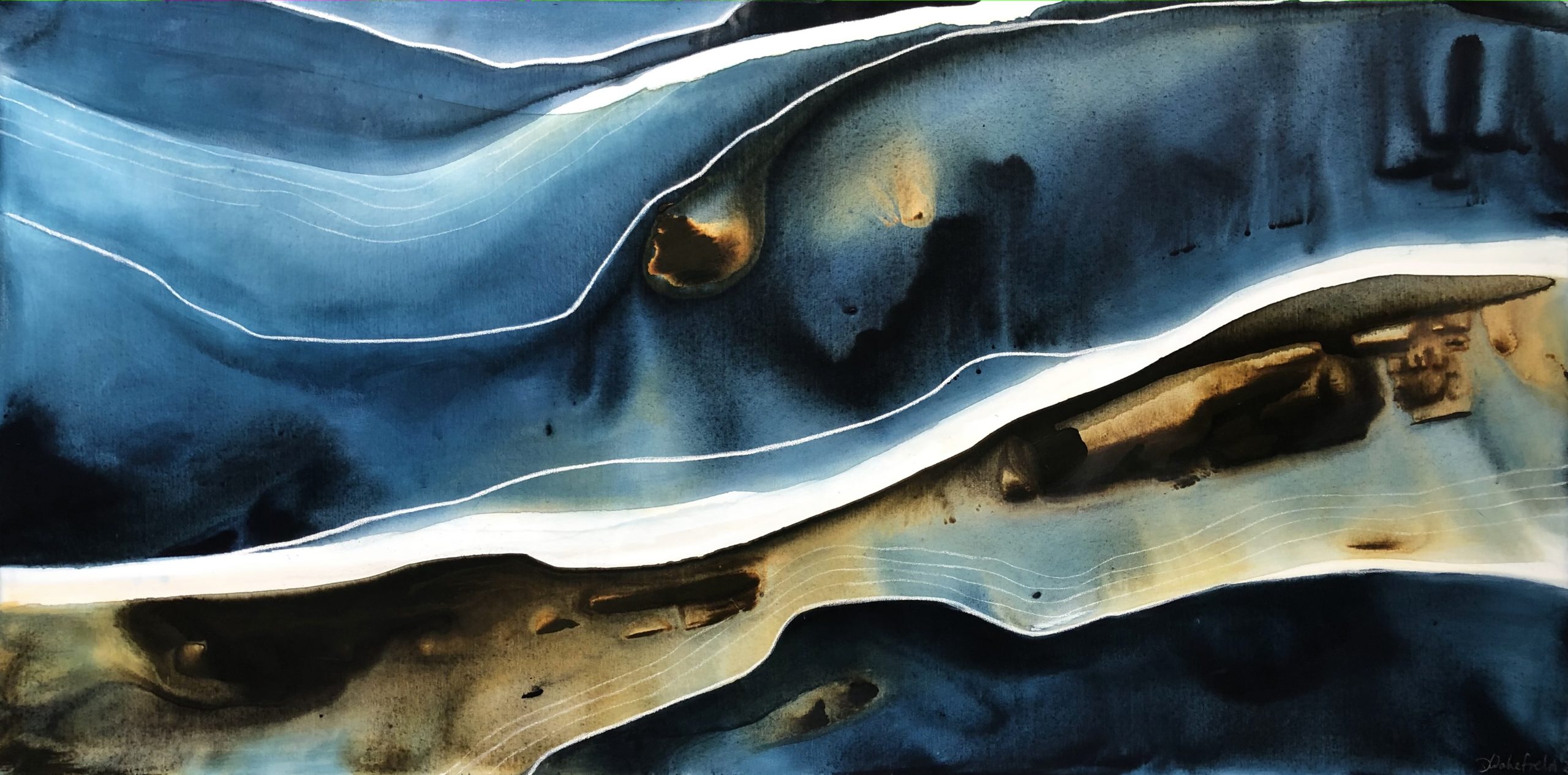 Dancing in the Dark by Dinah Wakefield is inspired by the light, the colours and the natural beauty of the Noosa region of Australia. “What I love most about Noosa is the interplay of light. From the oceans to the clouds, to the river estuaries and the hinterland, this canvas unfolds before me every day and finds expression in my paintings”.