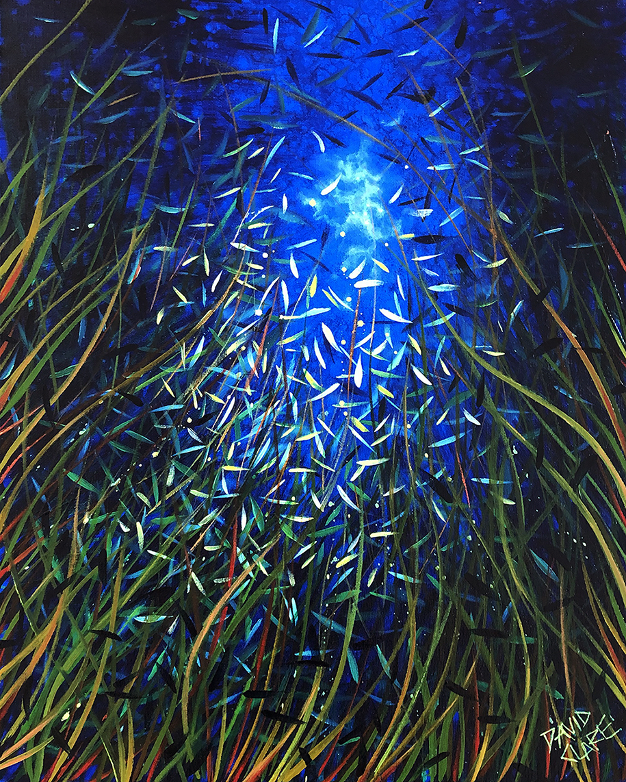 Dancing In The Dark by David Clare – I have been painting fish and underwater scenery for a while now, but this one is a bit different. It was originally a typical painting of fish flicking around in the ocean with the sun beaming through. But, I felt it was too dark, so put it aside for a year or so. Recently I decided to cut my losses and paint over it and start afresh, but, in a moment of inspiration I decided to paint a stroke of seagrass… and I liked it. So, I kept going and it gave the painting the life that it needed. A few more highlight fish and it was done, finally. This is not so much an ocean scene, but maybe an estuary scene. I liked it so much I even framed it.